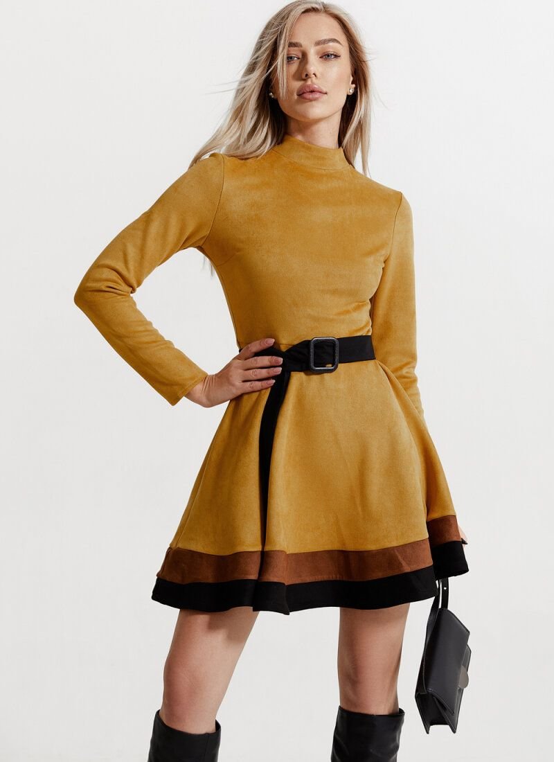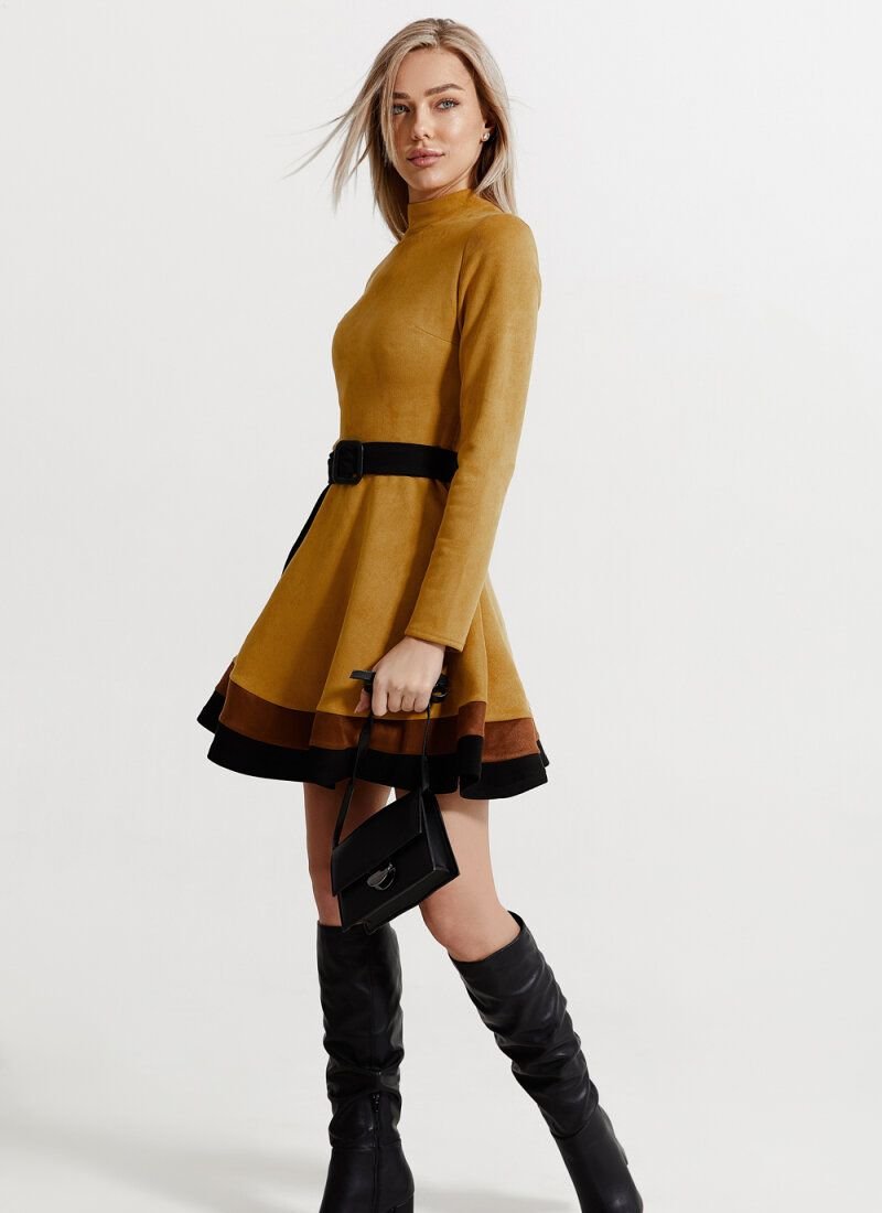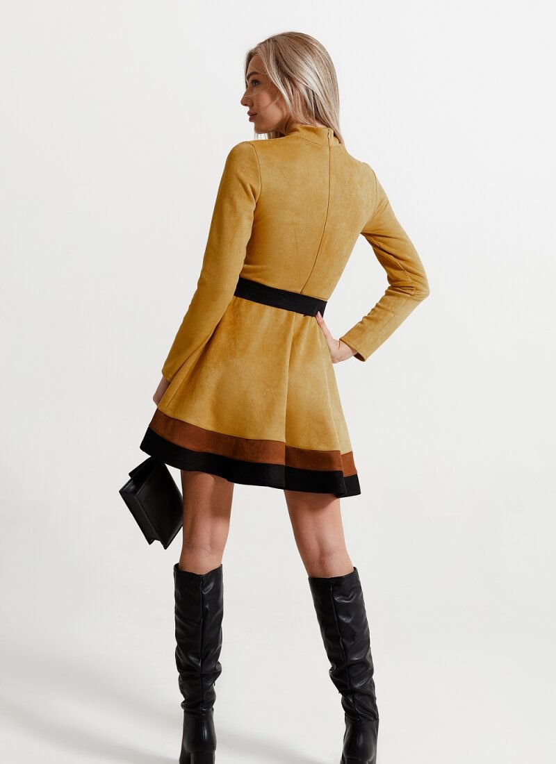 Velvet eco-suede gives the dress softness and allows you to feel comfortable throughout the day. A fitted cut with a cut-off waist and a flared skirt forms a feminine "hourglass" silhouette. The hem was complemented with wide stripes of contrasting colors.