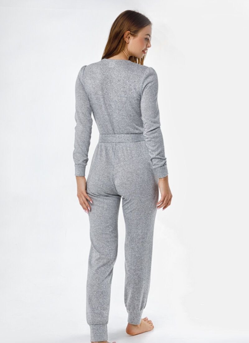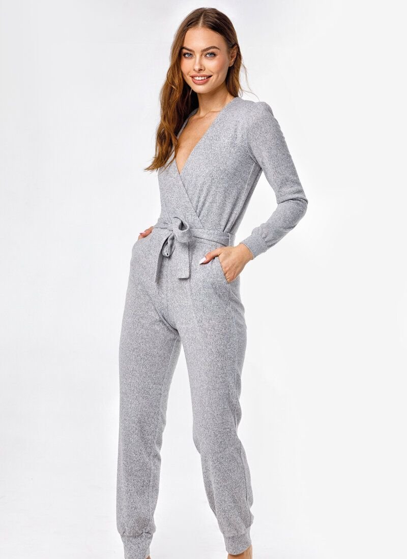 The jumpsuit of neutral gray color is made of knitwear with an admixture of angora wool, which allows you to feel as comfortable as possible. Makes the silhouette fitted belt-ribbon of the main material.