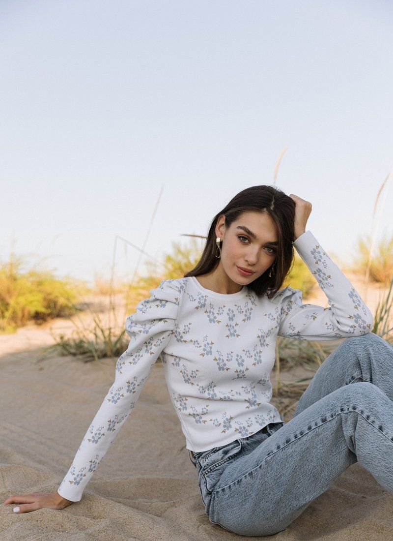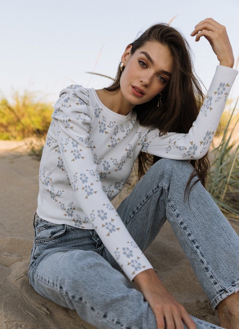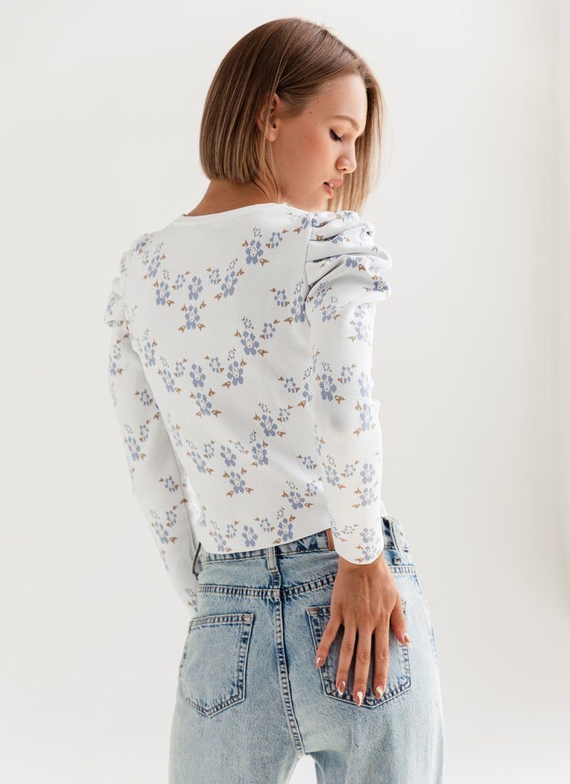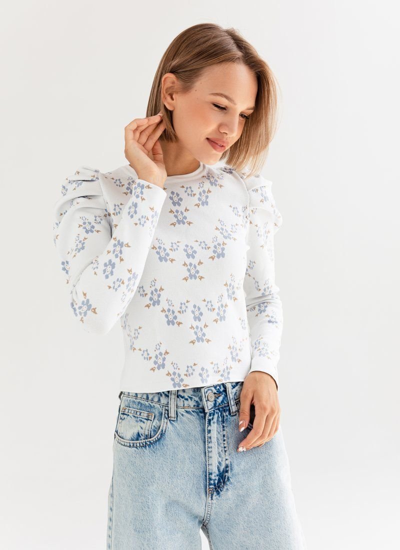 Knitted jumper in a delicate floral print. The model is decorated with lantern sleeves, which adds zest to it.