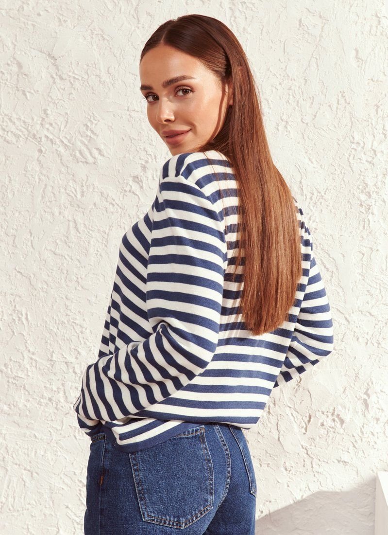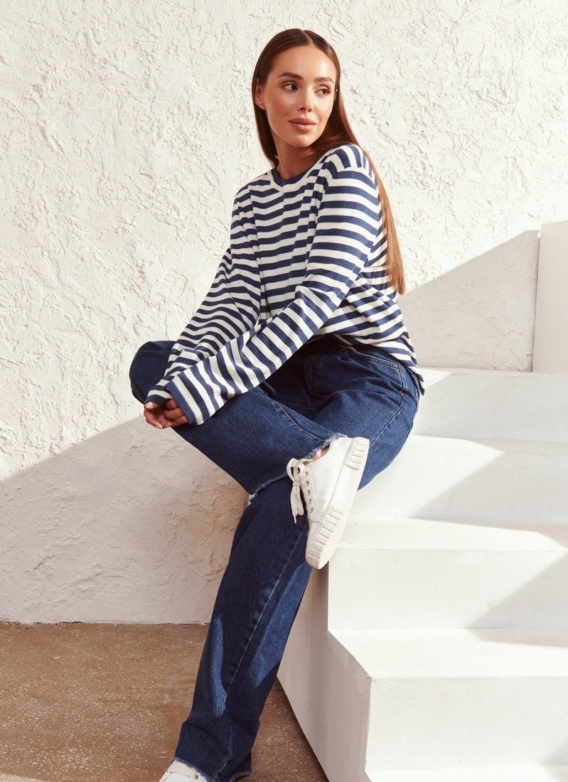 Striped jumpers - vests, remain relevant regardless of fashion trends. The blue shade model is made of soft knitwear. In SS'21, it can be combined with trendy wide jeans, leather or palazzo trousers. Accessories - bright bags, large earrings and chains will also help to add the spirit of modernity to the image.