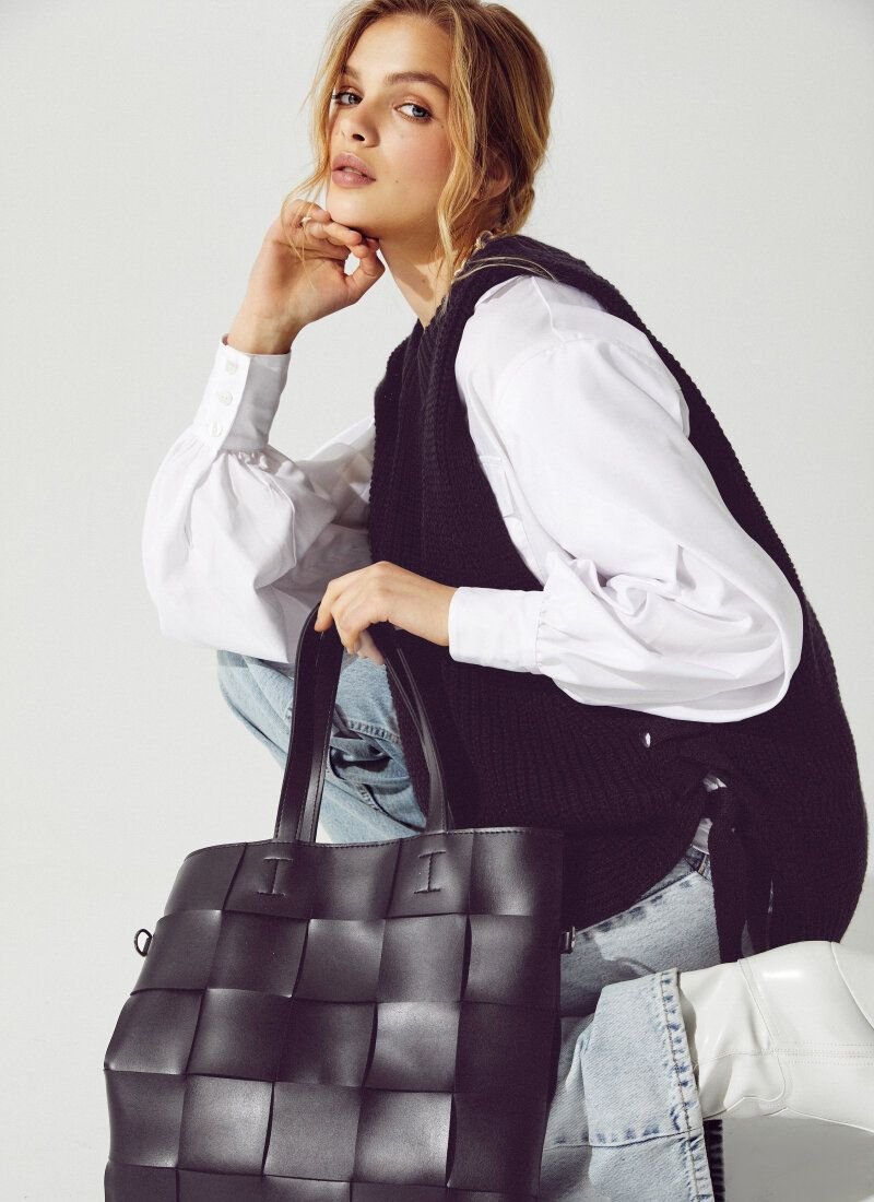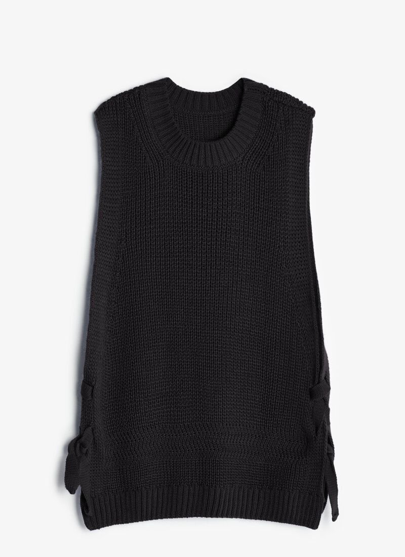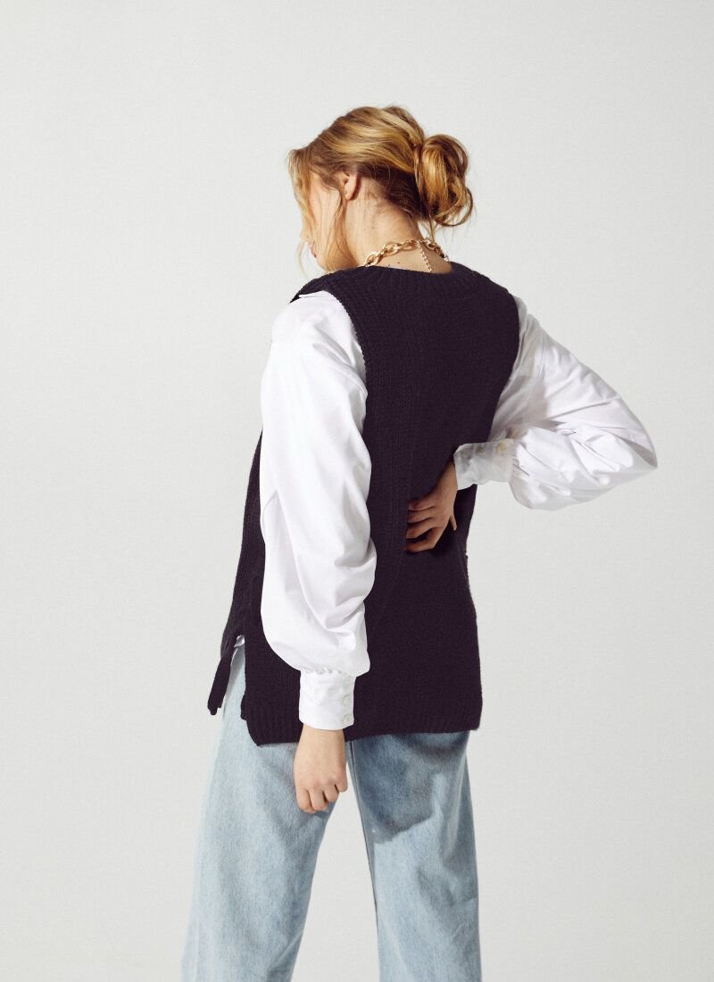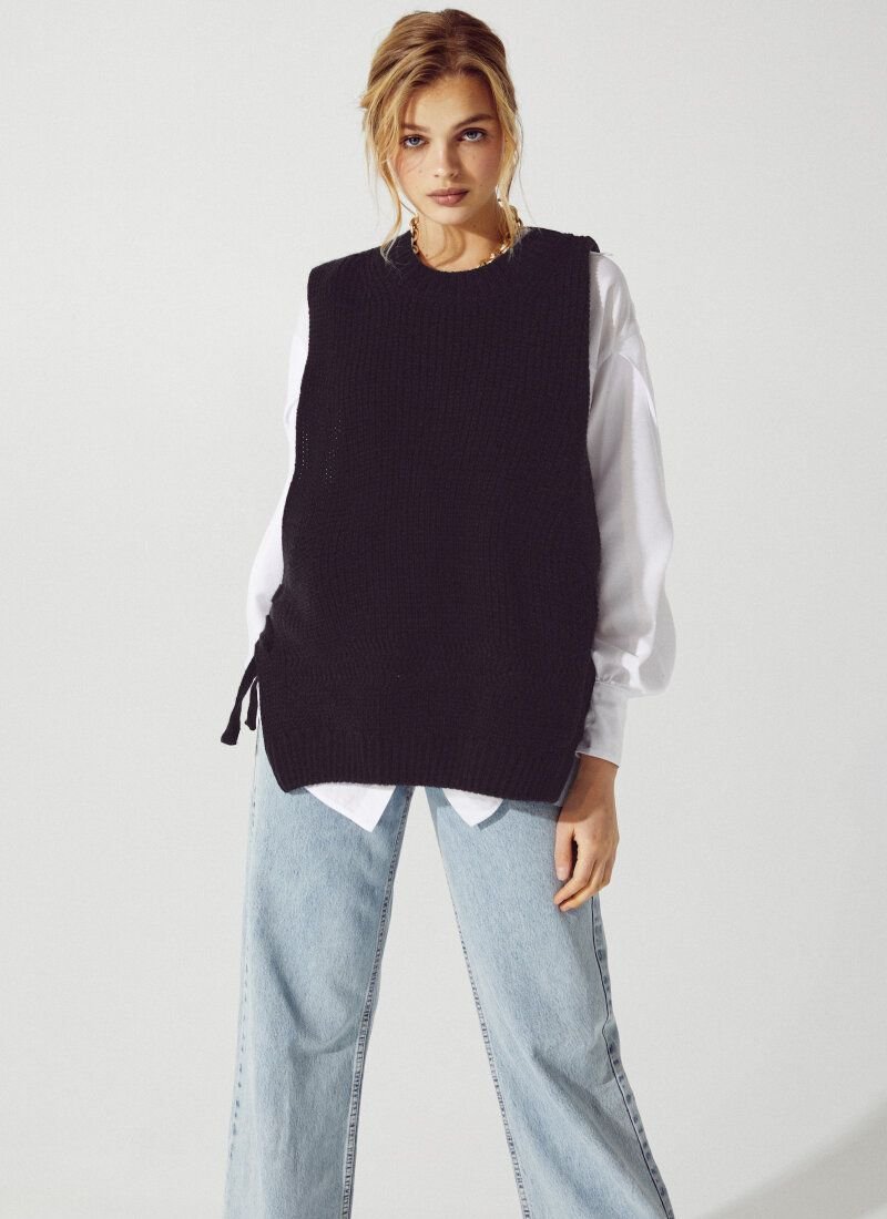 The black knitted vest fits perfectly into the trend inspired by the preppy style. Similar models can be seen in the collections of Prada, Lacoste and Marc Jacobs. The model is made of soft knitwear with textured knitting. The product was added relaxation, with the help of an asymmetric hem and side ties.