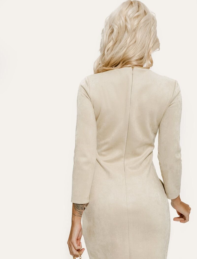 Fitted beige suede dress: round neck, long sleeve, a small assembly at the waist, a tight skirt and two pockets in the seams.