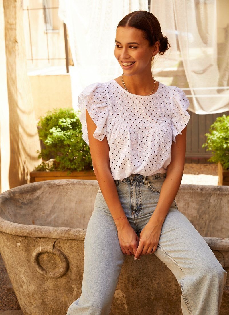 An actual summer blouse made of stitching with floral embroidery. The original flared cut of the blouse is complemented by a neat yoke and wide flounces imitating sleeves.
