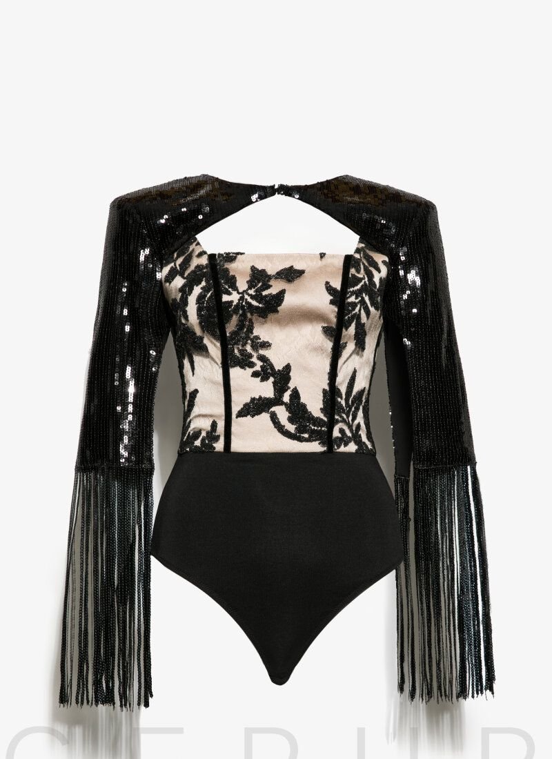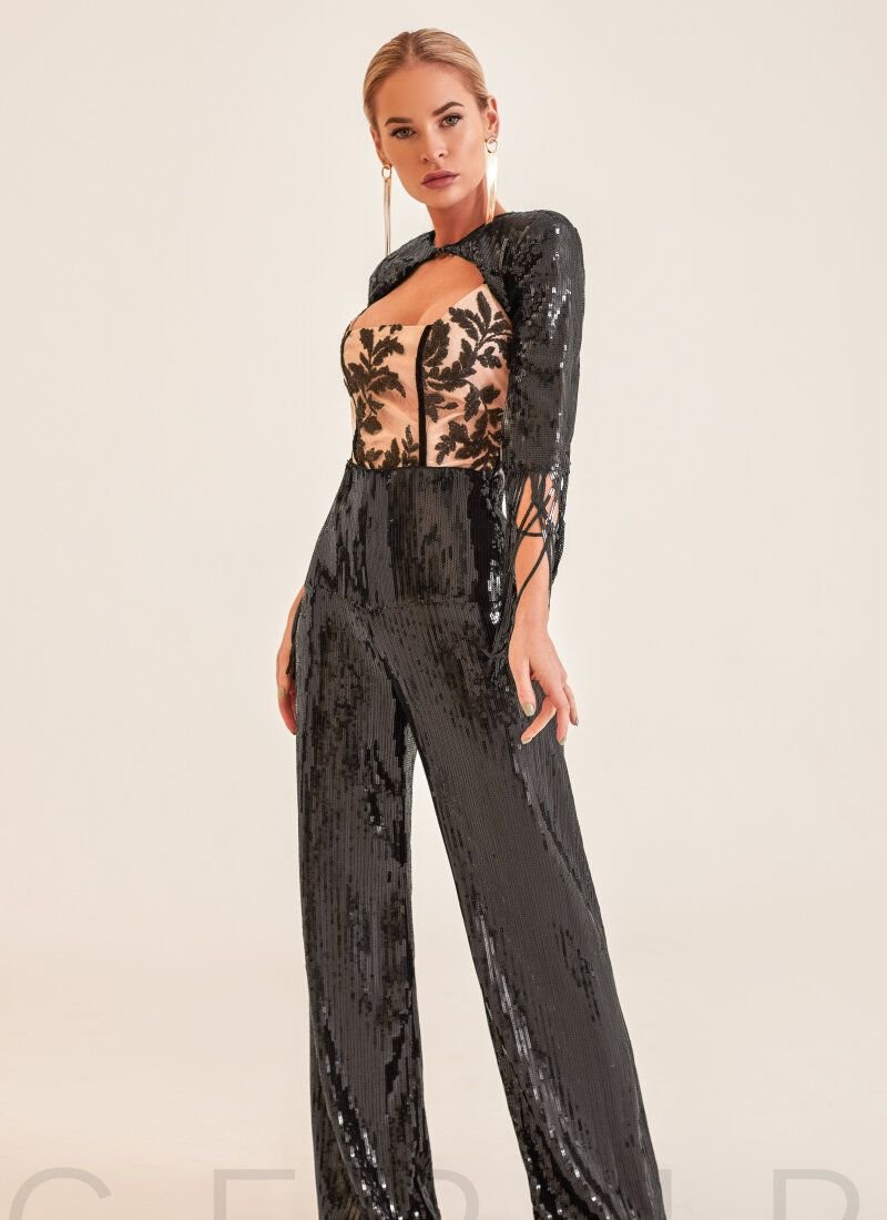Elegant evening suit from Gepur designers: bolero lined with a pleasant fabric to the body with modeling inserts in the shoulders, button closure, long sleeve fringed with sequins, bodysuit with adjustable velvet straps, square neckline and floral scattering of contrasting sequins, flared trousers with a high fit, studded with shiny decor. The star collection is presented by the famous singer Anna Sedokova.