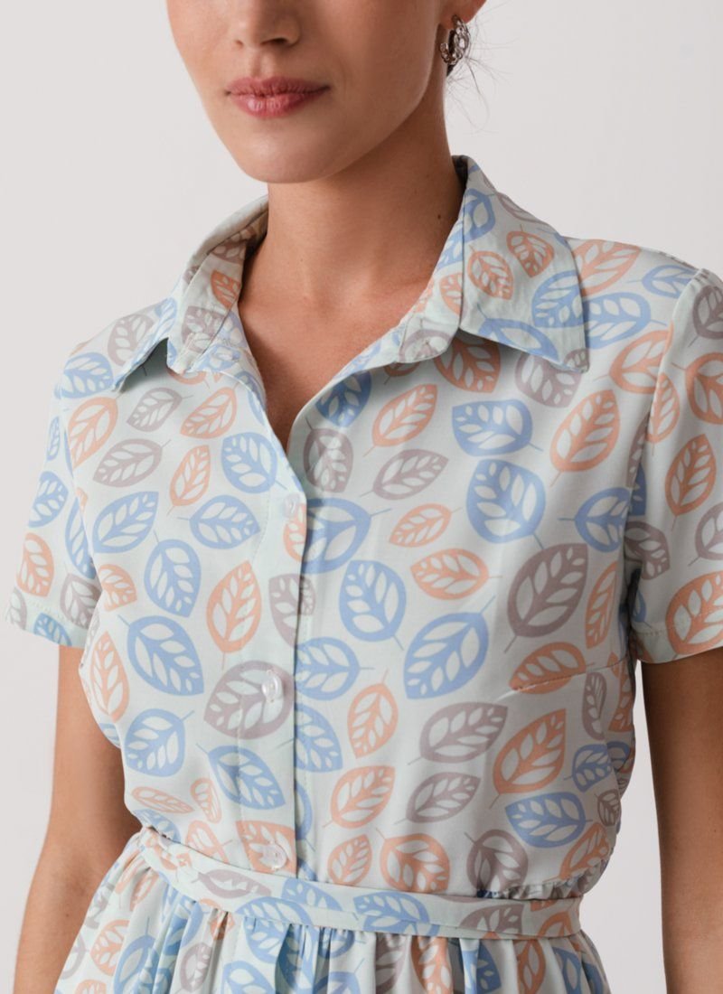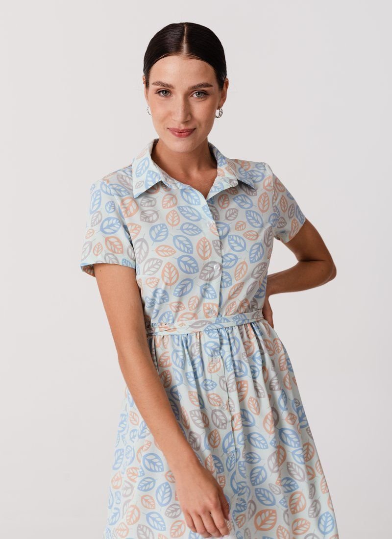 The dress resembles a set of short-sleeved shirts and a fluffy mini skirt. A delicate blue color and a large floral pattern work to attract attention in the product. A thin lightweight material was chosen for sewing the model.