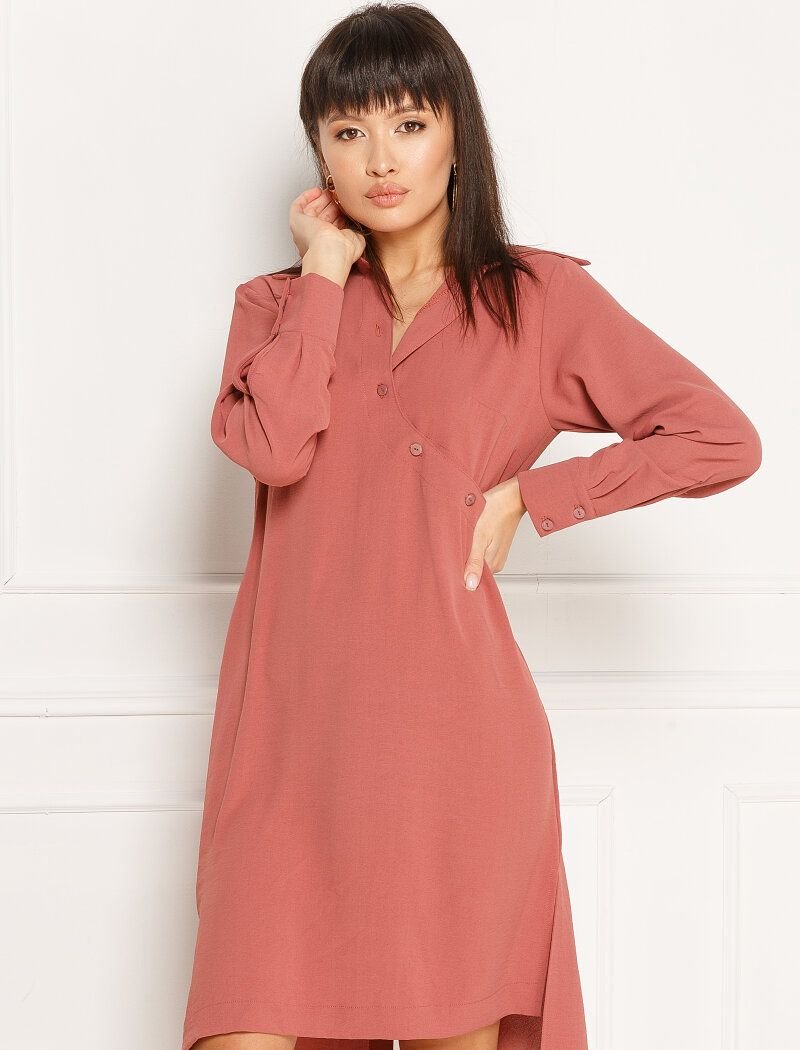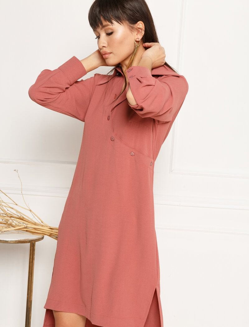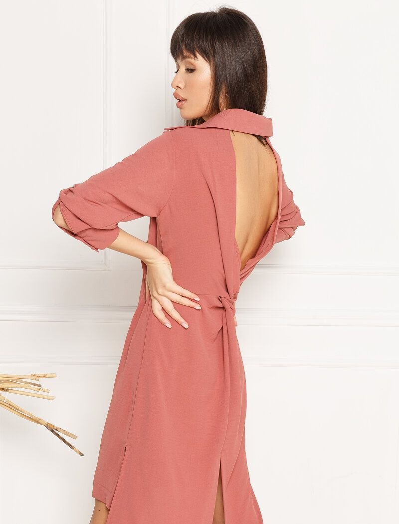 A fitted dress made of flowing fabric of a freeze shade. Classic turn-down collar, long sleeve. A beveled placket with buttons on the front, an open back, pockets in the seams, two slits on the sides and one on the back.