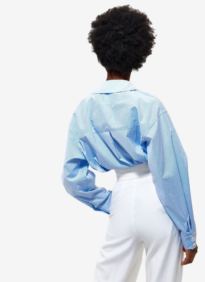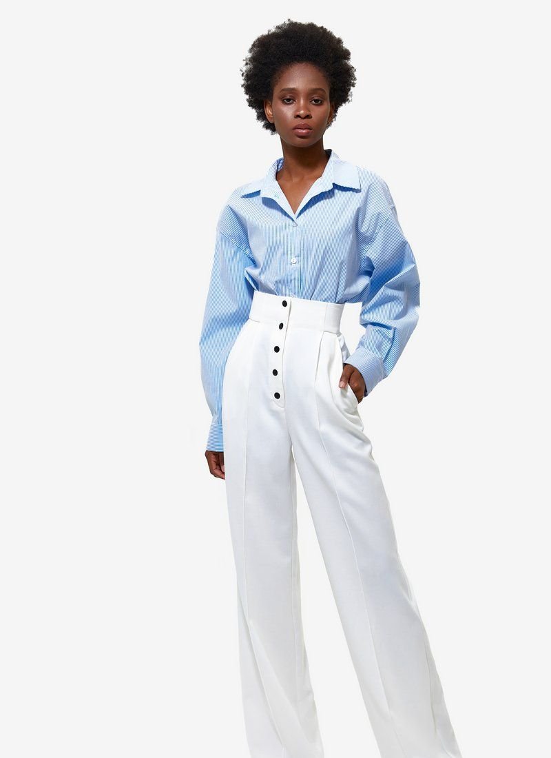 Blue oversize shirt of the classic striped model, with buttons. Long sleeve with wide cuffs. With such a thing in the wardrobe, you can easily make up a lot of options for images.