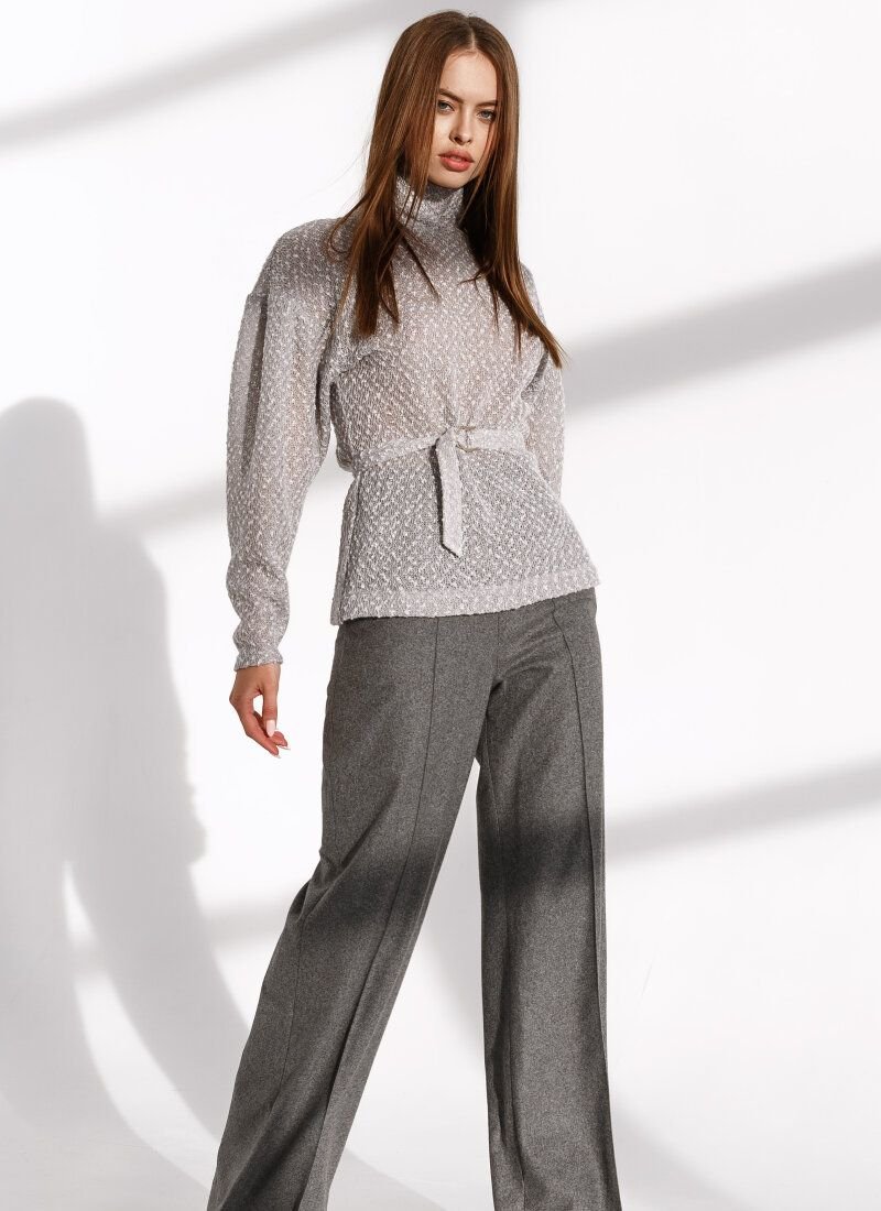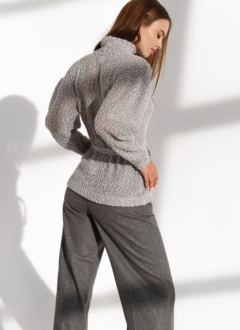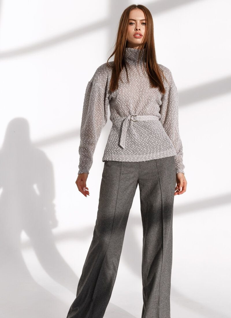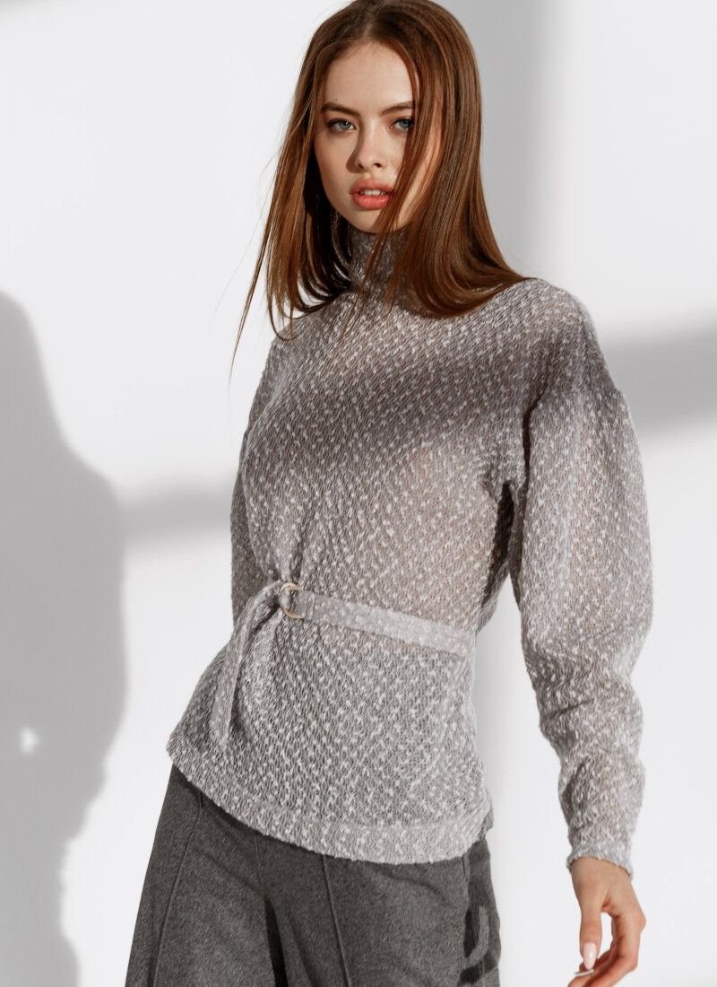A gray turtleneck will easily keep company with jeans and sneakers with a massive sole, as well as a feminine skirt and ankle boots with a stable heel. The delicate interlacing of fine threads of knitted knitwear with the boucle effect gives the model airiness, preserving thermal properties. A removable belt with a double buckle will allow you to put an emphasis on the waist.