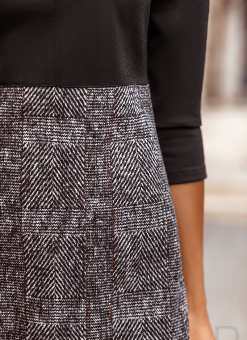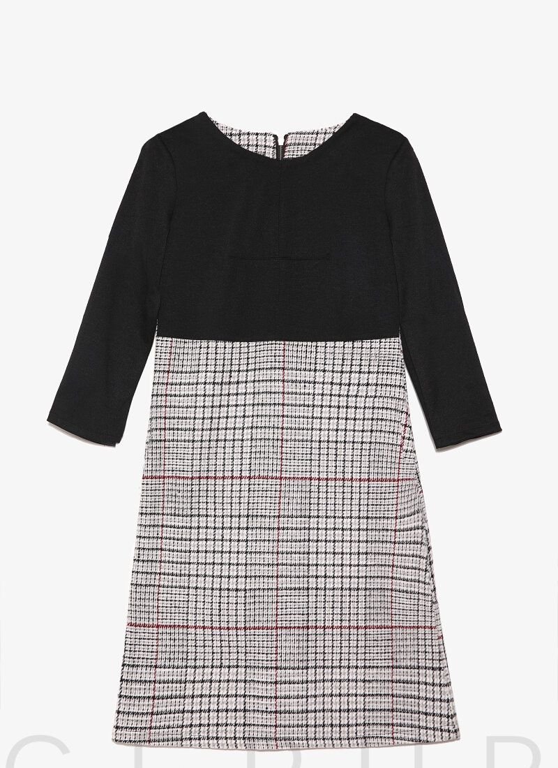 A two-tone elegant dress with a flared cut with an inflated waistline, a laconic yoke and a tight 3/4 sleeve made of contrasting knitted fabric. Please note that the checkered print may differ (see additional photos).