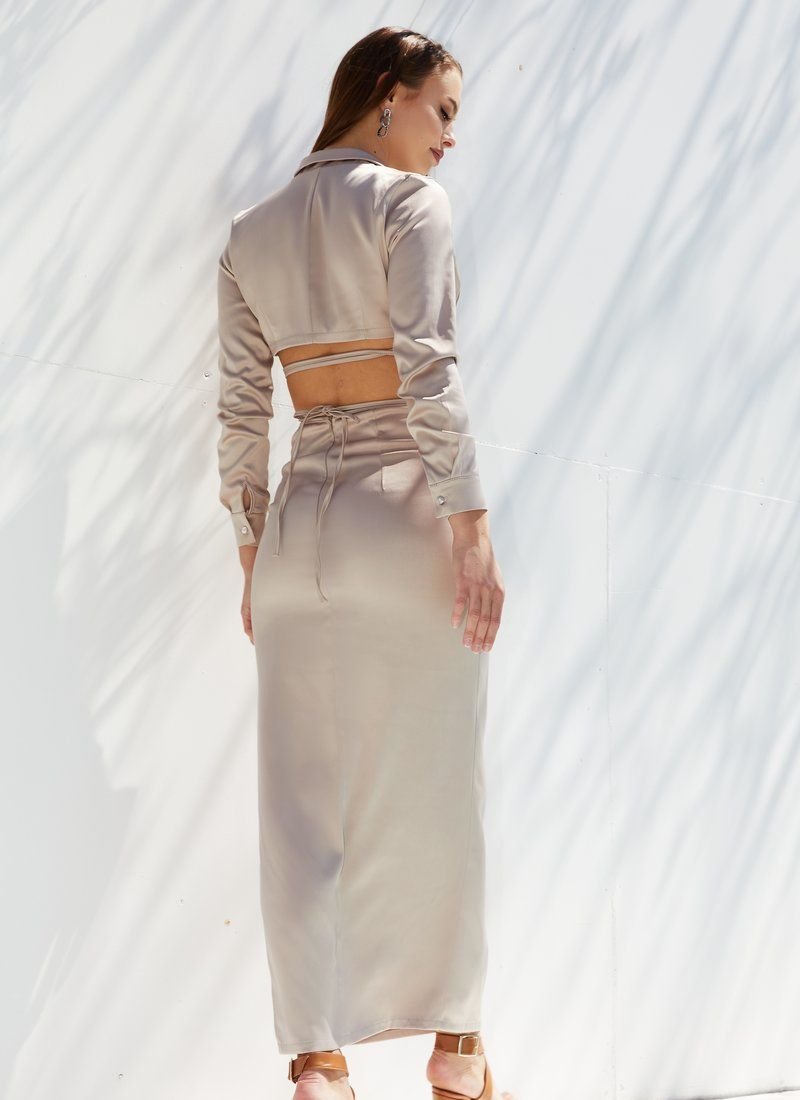 A beige suit is perfect for an image for a social event. The set consists of a maxi skirt with a seductive side slit and a cropped jacket with a drawstring. The satin material gives the model a light shine.