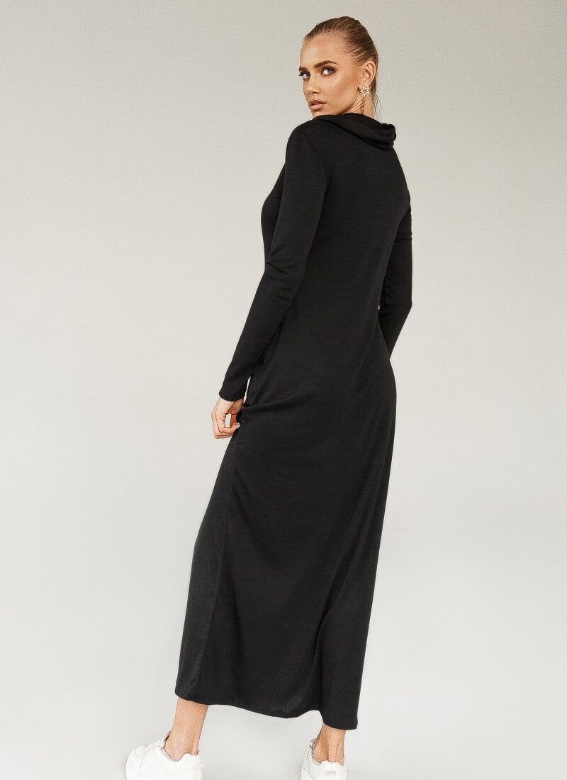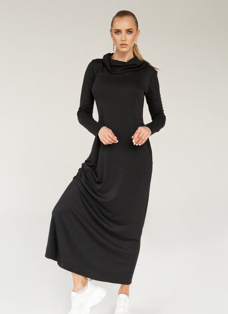 The black maxi dress meets the basic requirements for casual wear: naturalness of materials and practicality. The free-cut model is sewn from a soft stretch fabric based on cotton. The collar-collar shifts the emphasis to the neck. Welt pockets are made on the hip line.
