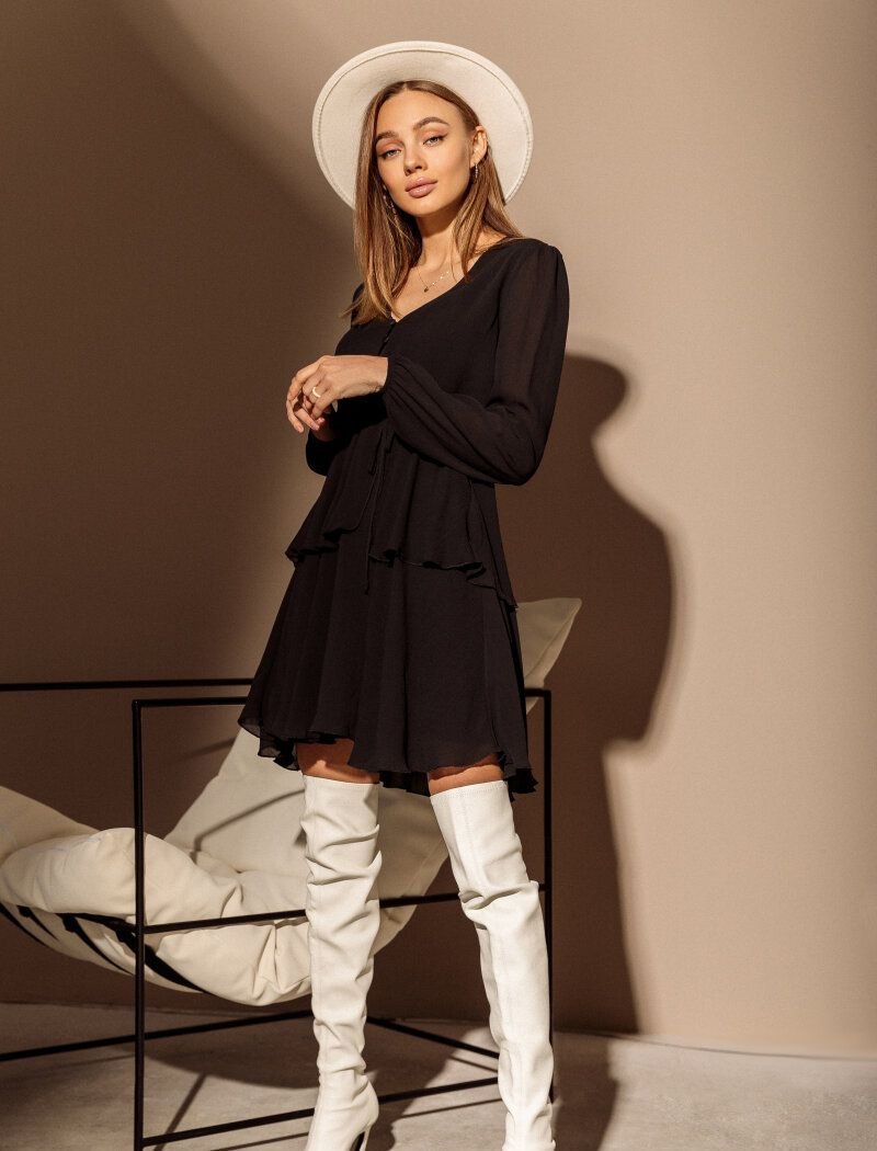 Dresses with flounces could be seen at the FW'20/21 shows in the collections of Dolce & Gabbana and Alberta Ferretti. The model, made of light chiffon, is complemented by a drawstring with a drawstring at the waist and a layered skirt with flounces. The button closure on the front forms a refined v-shaped neckline.