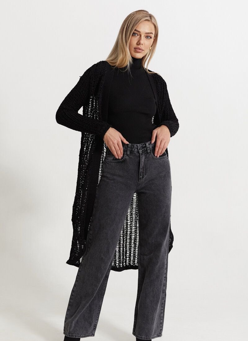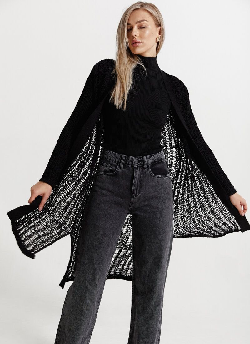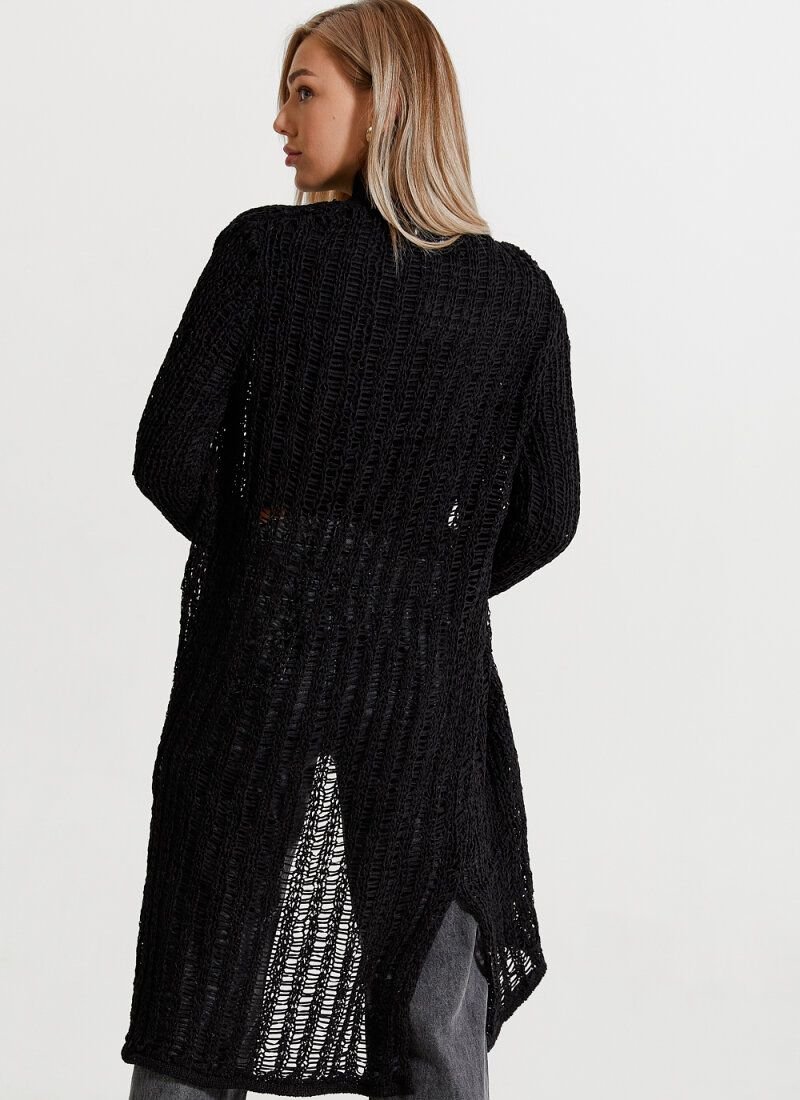 Elongated cardigan with tight sleeves and small slits on the sides.