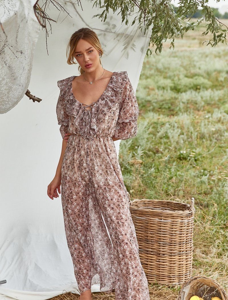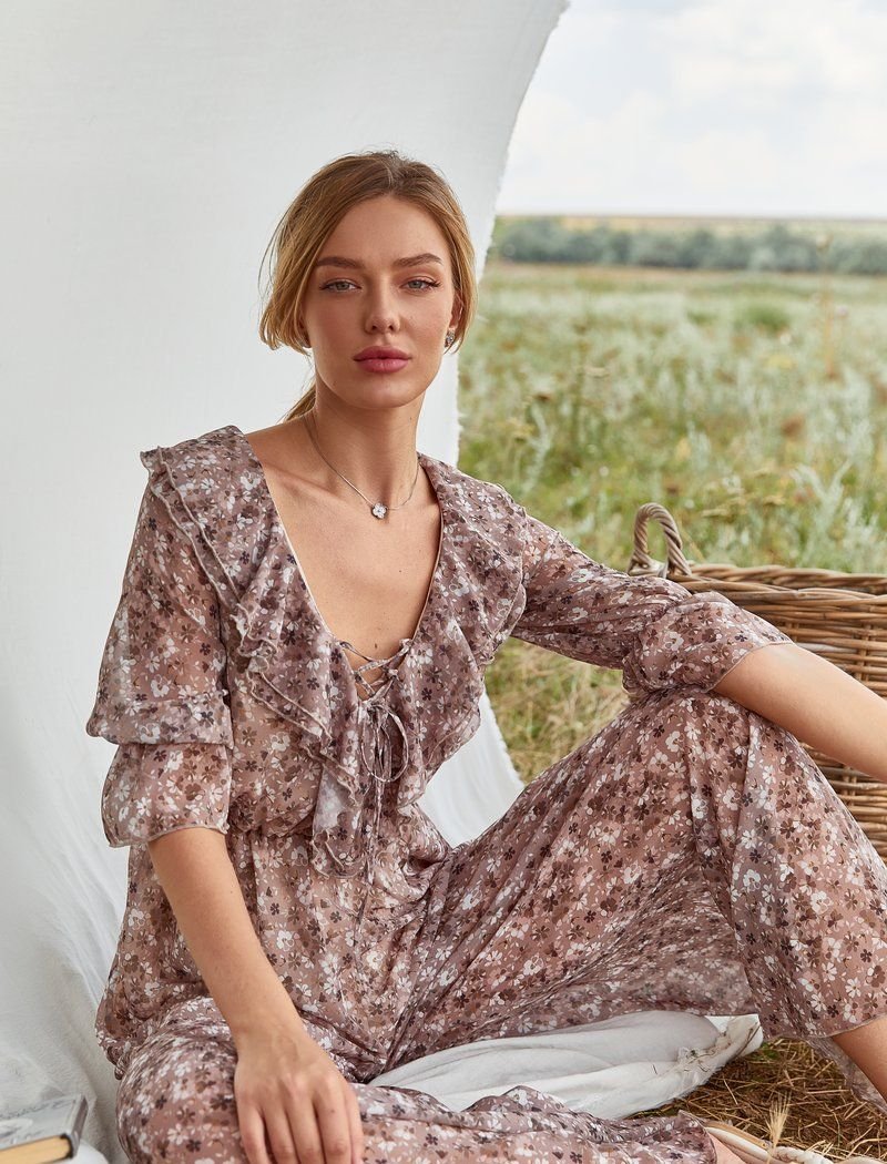 A spectacular summer jumpsuit made of airy chiffon. Deep v-neck, decorated with lacing and flounces, 3/4 sleeve with elastic cuff, closed elastic band at the waist and flared trousers.