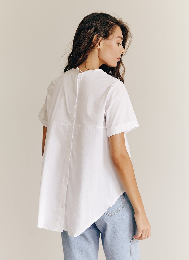 White shirt with short sleeves, elongated edges in front, which allows you to make a bow, or wear it freely. Button-down shirt at the back.