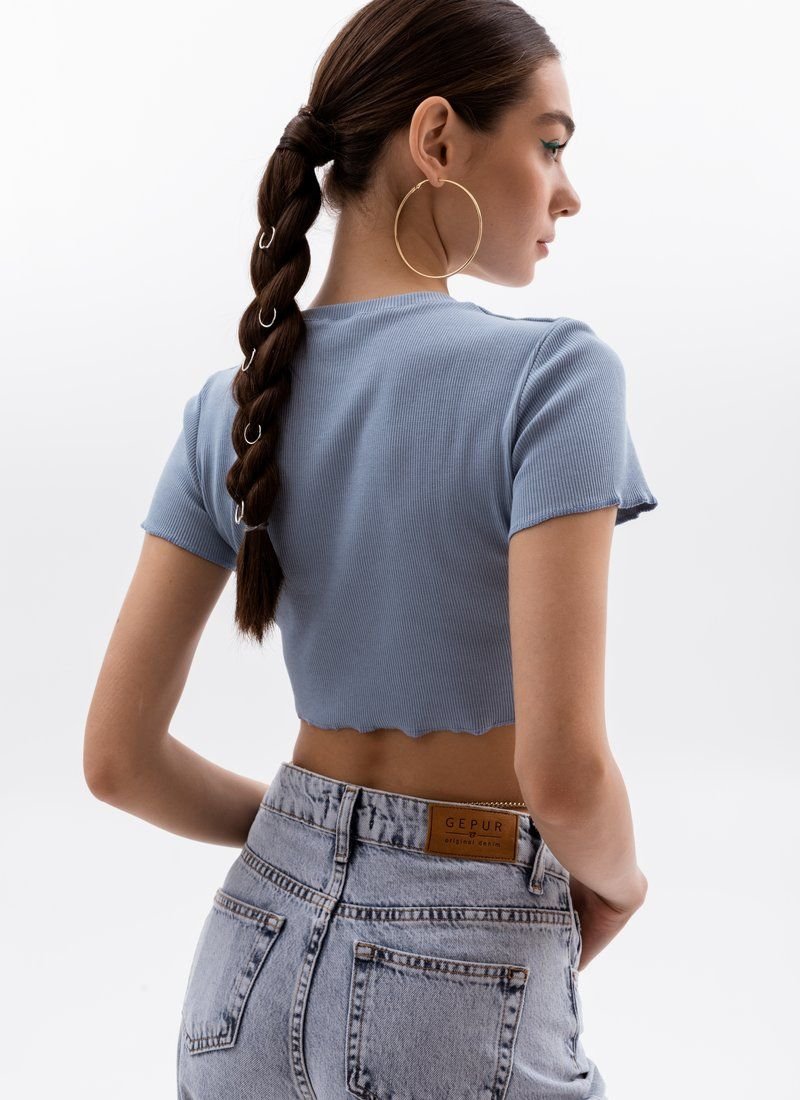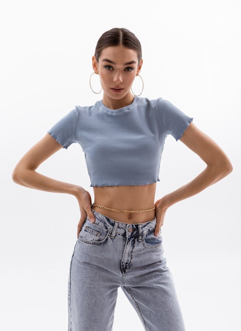 Ribbed knitwear and a cropped cut make the top an ideal option for the summer season. The neutral blue shade allows you to combine the model with things in any range.