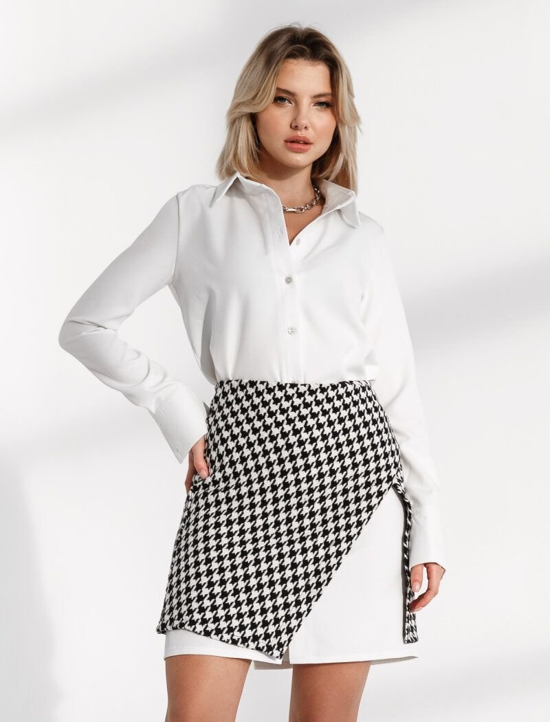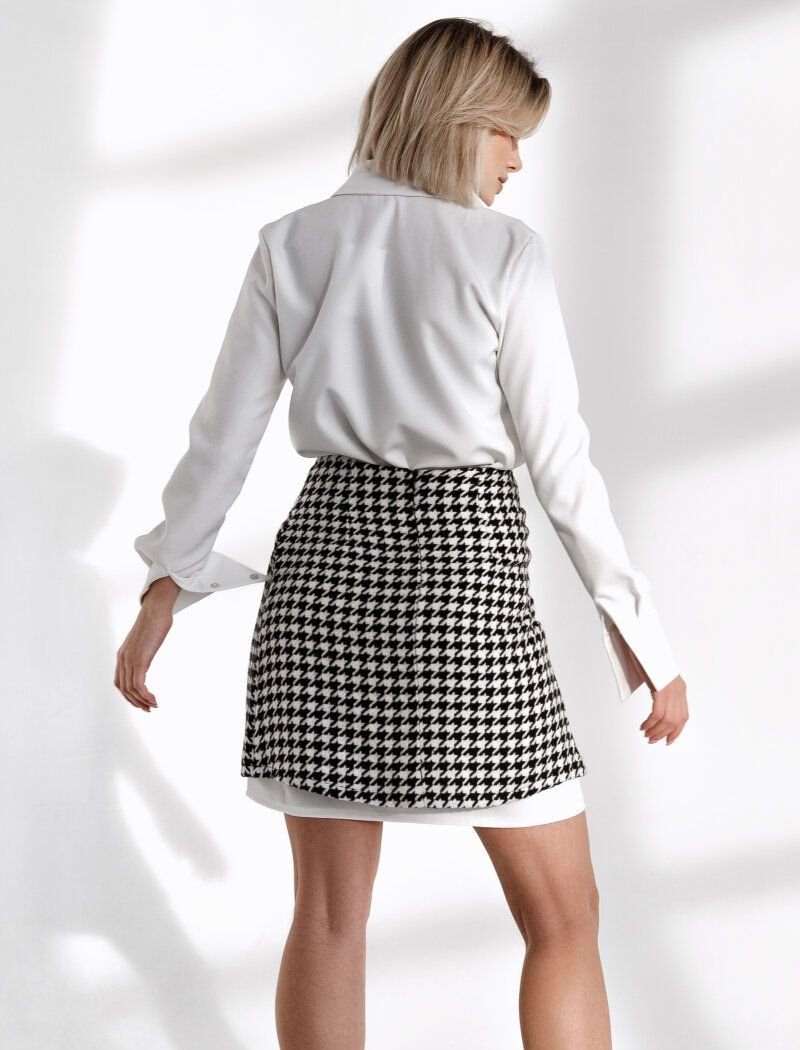 The set is suitable for a stylish office bow. The basic white color of the elongated shirt is balanced by the large "crow's foot" print of the mini skirt. The bottom of the suit was complemented by a seductive slit in the front.