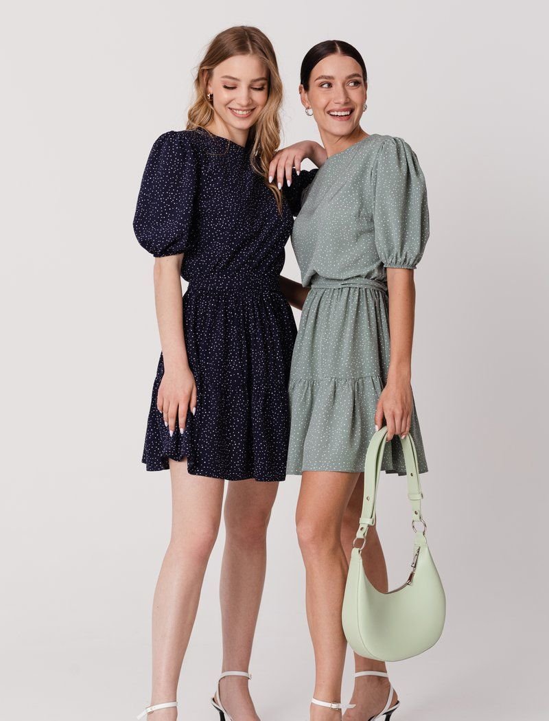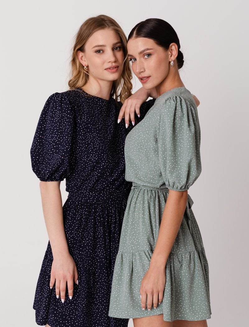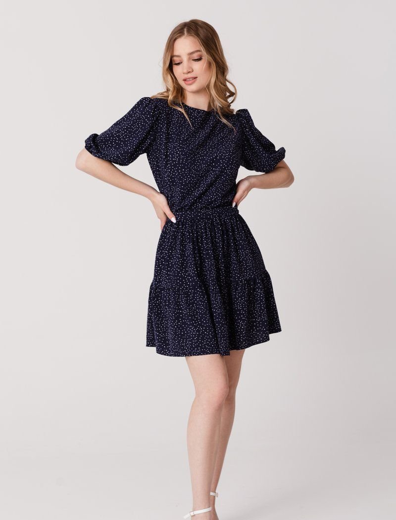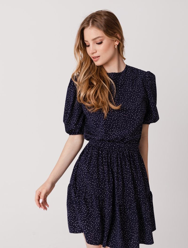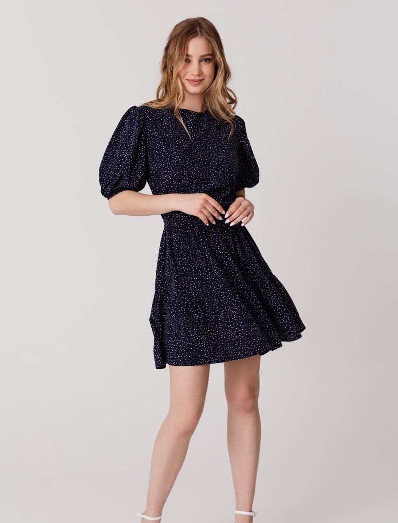 A small pea print automatically makes almost any thing more romantic, and a direct confirmation of this is a blue dress. The set mood is also supported by short sleeves of boofs. For sewing a product with a flounce on the hem and a removable belt, a thin soft material was used.