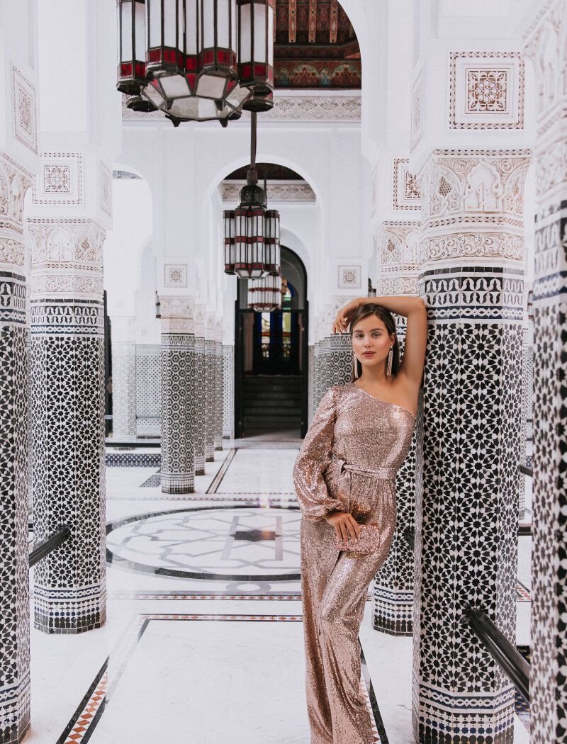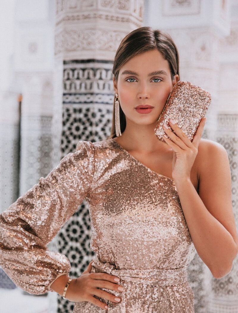 A jumpsuit with shimmering sequins is a bold alternative to an evening dress. To create a model from the autumn-winter collection, Gepur designers chose a soft fabric that comfortably fits the body. The right mood for the jumpsuit is set by an asymmetric cut, a voluminous sleeve and flared trousers that create soft tails. The star collection is presented by the famous blogger, it-girl and finalist of "Miss Belarus 2016" Masha Lobanova.