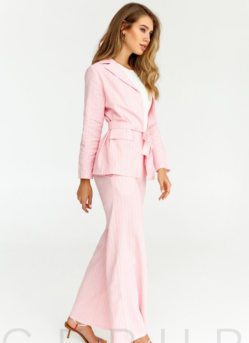 Powdery suit for the warm season in a classic thin stripe. A loose-fitting jacket without buttons with a turn-down collar and lapels, two decorative flaps in front. Straight trousers with a high waist. The suit is complemented by a removable fabric belt.