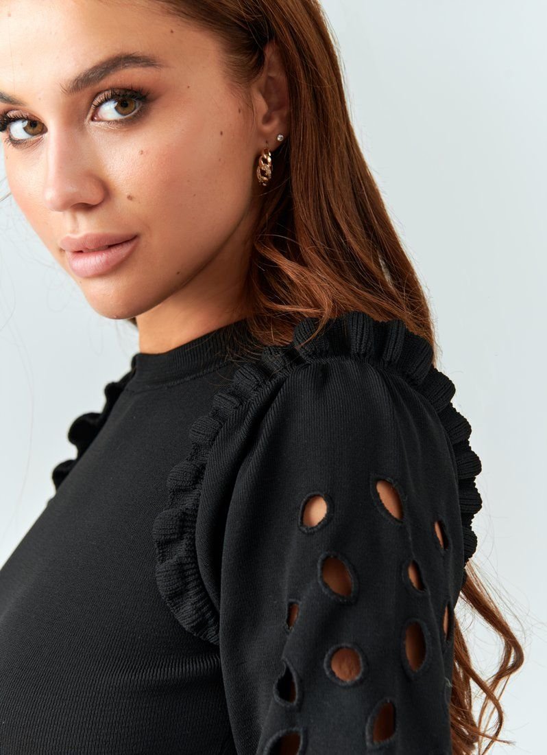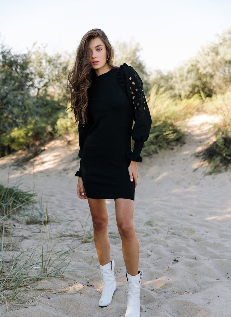 Black knitted mini dress fits perfectly on the figure. The accent of the product is represented by puffy sleeves, decorated with frills and round cutouts along the length of the sleeve. This dress is perfect for both a casual look and a more evening one.