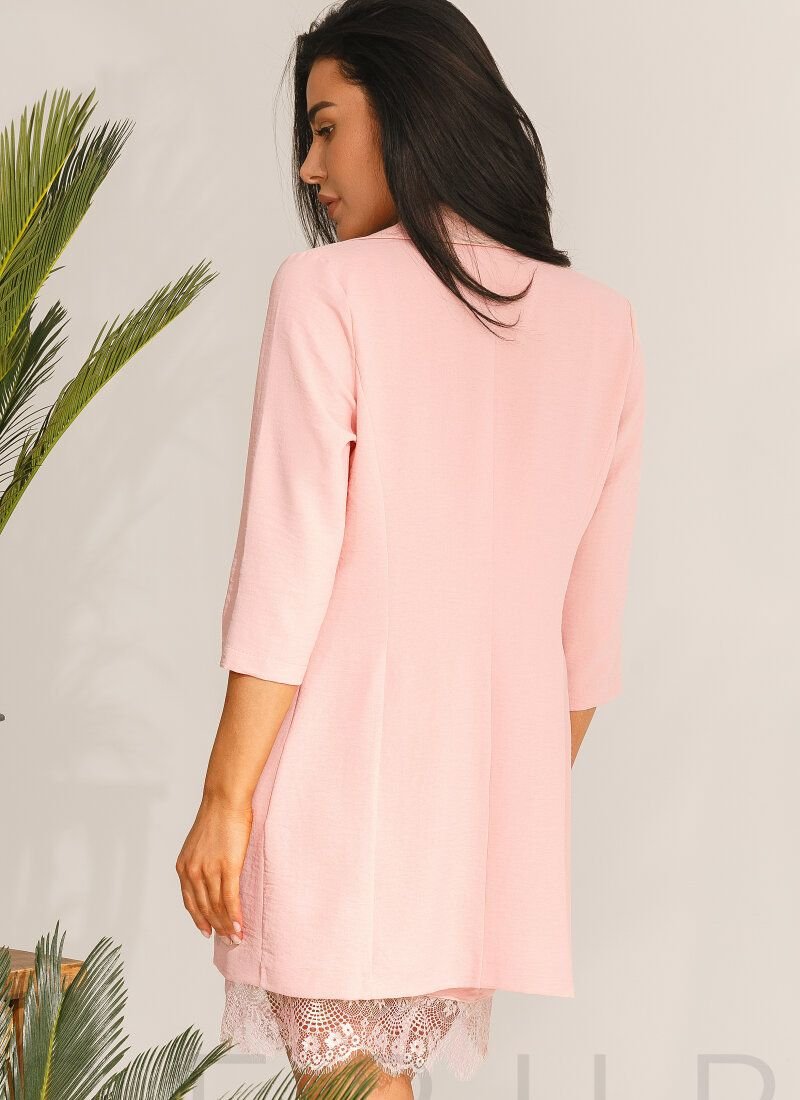 Stylish powdery suit. Elongated single-breasted blazer. Fitted cut, turn-down collar with lapels, 3/4 sleeve and two welt pockets in front. A short silhouette dress with narrow non-adjustable straps, complemented by a lace hem.