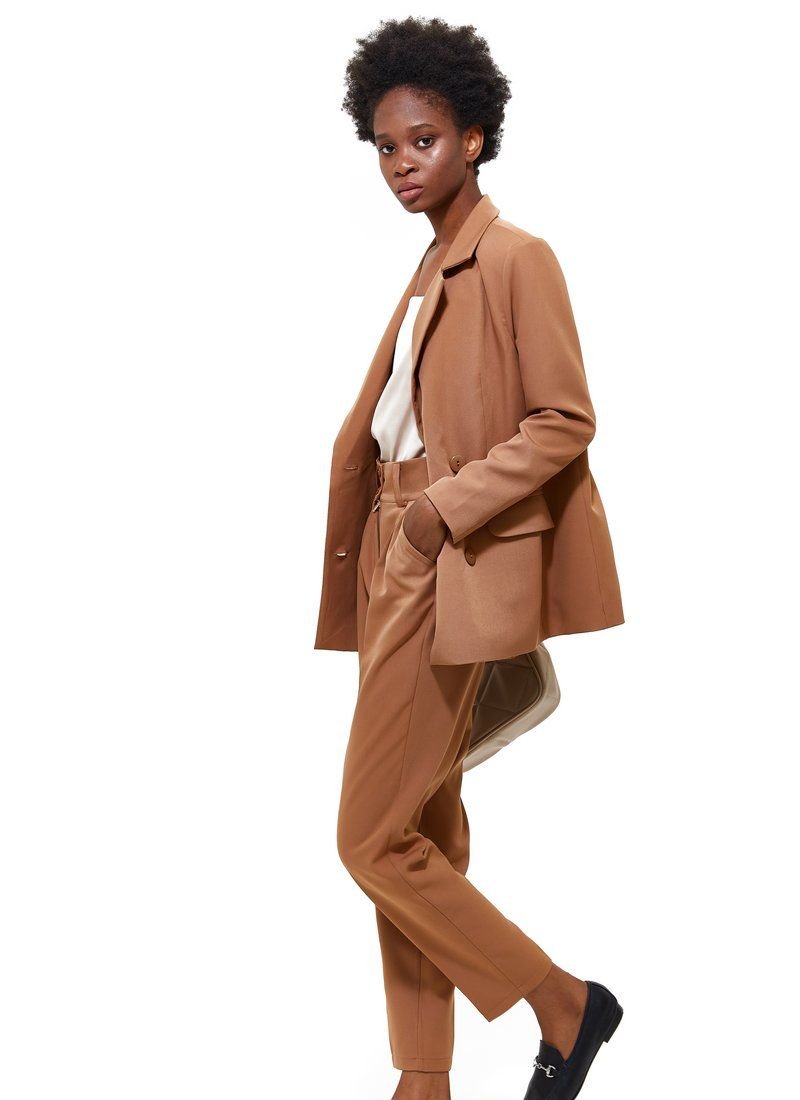 The pantsuit has already become a basic part of the wardrobe. We have a beige model in front of us. Double-breasted lined jacket with inserts in the shoulders for a better shape, rectangular lapels, with pockets. High-waisted trousers with buttons and zippers, with pockets on the sides.