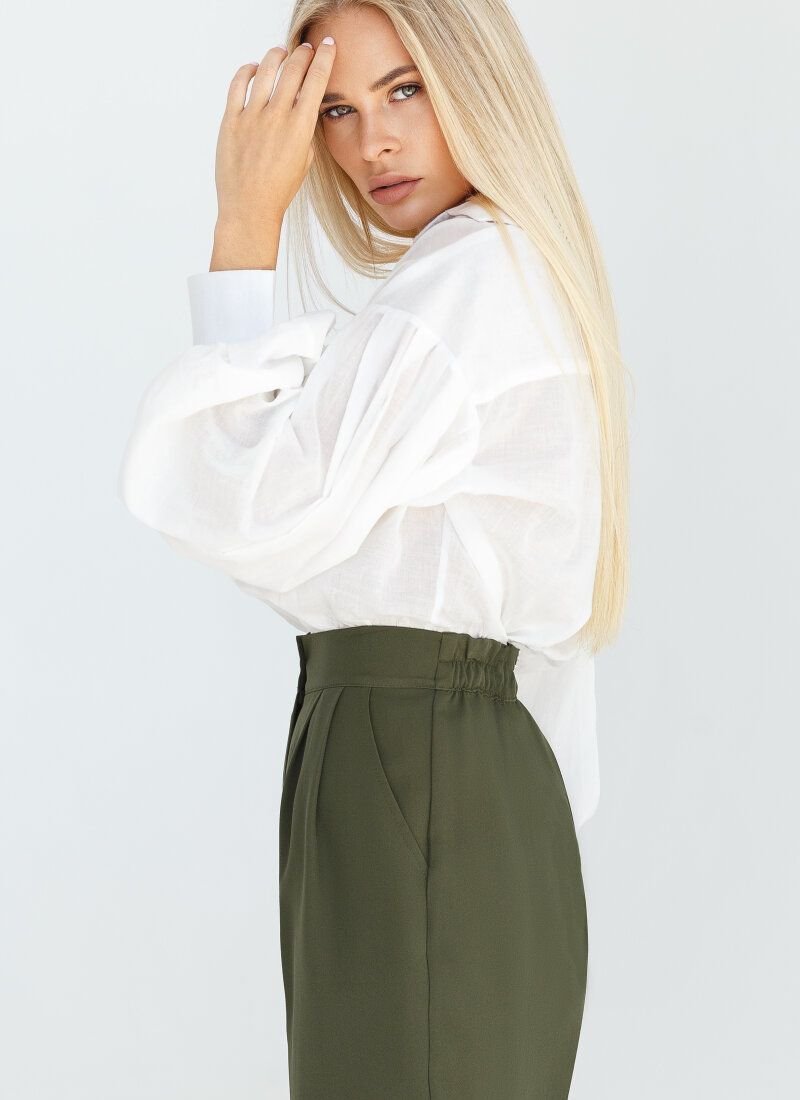 This lightweight shirt is not devoid of femininity, despite the loose fit. The turn-down collar is complemented by a button placket along the entire length. The volume of the sleeves is created by wide pinches on the shoulder line and cuffs. Small incisions are made on the side seams, which round the hem.