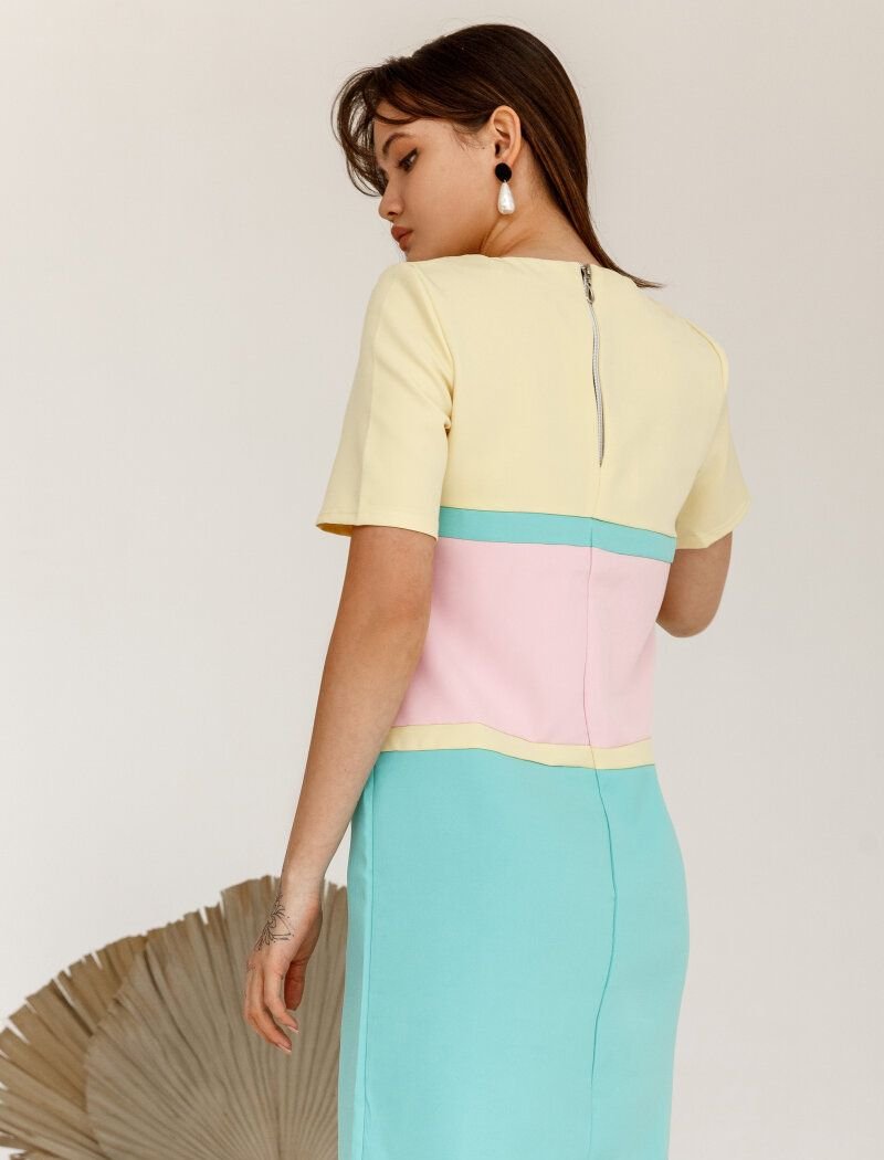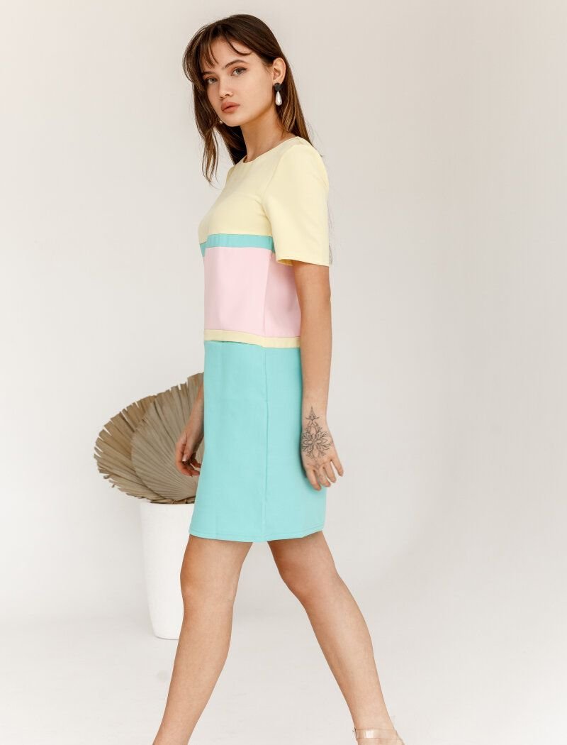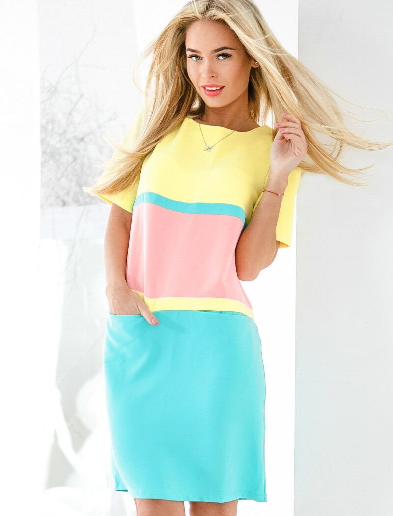 Summer dress in the color block style with short sleeves and a loose skirt, complemented by two pockets in the seams.