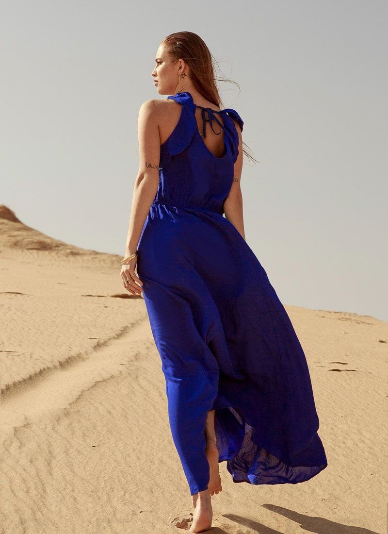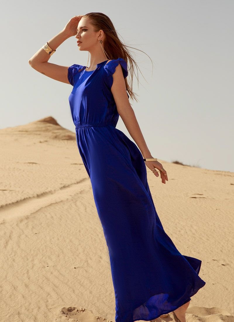 A long summer sundress made of light flowing fabric: small slits on the shoulders, wing sleeves, an elastic insert at the waist and a cutout on the back, complemented by ties.