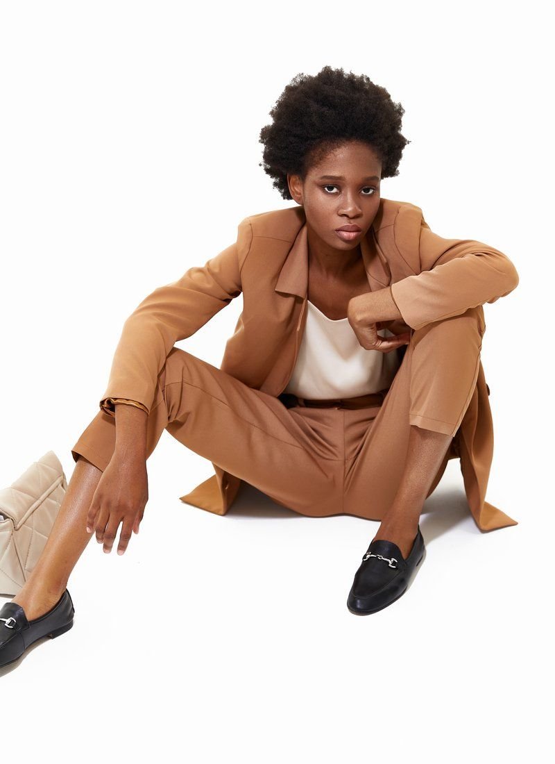 The pantsuit has already become a basic part of the wardrobe. We have a beige model in front of us. Double-breasted lined jacket with inserts in the shoulders for a better shape, rectangular lapels, with pockets. High-waisted trousers with buttons and zippers, with pockets on the sides.