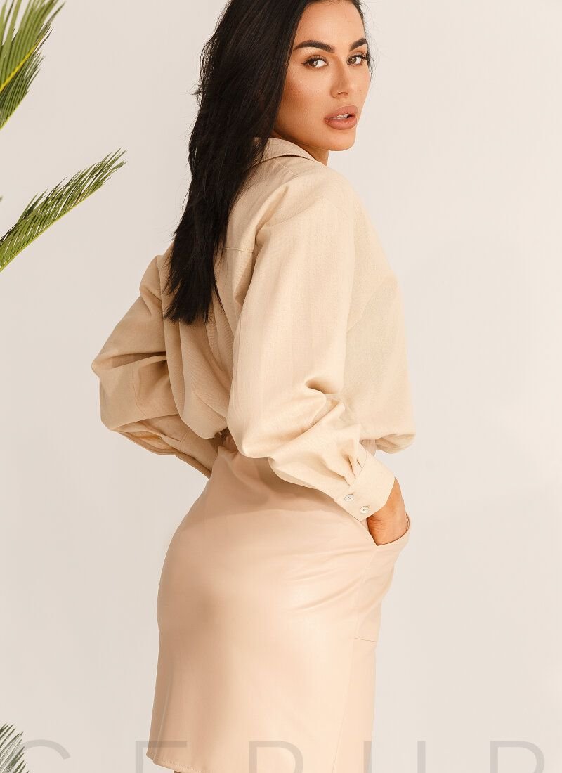 Beige straight-cut skirt made of eco-leather on a fabric basis. Elastic insert at the waist, two patch pockets in front, decorative button placket and slit.