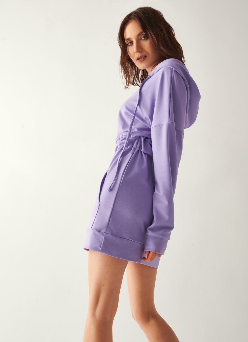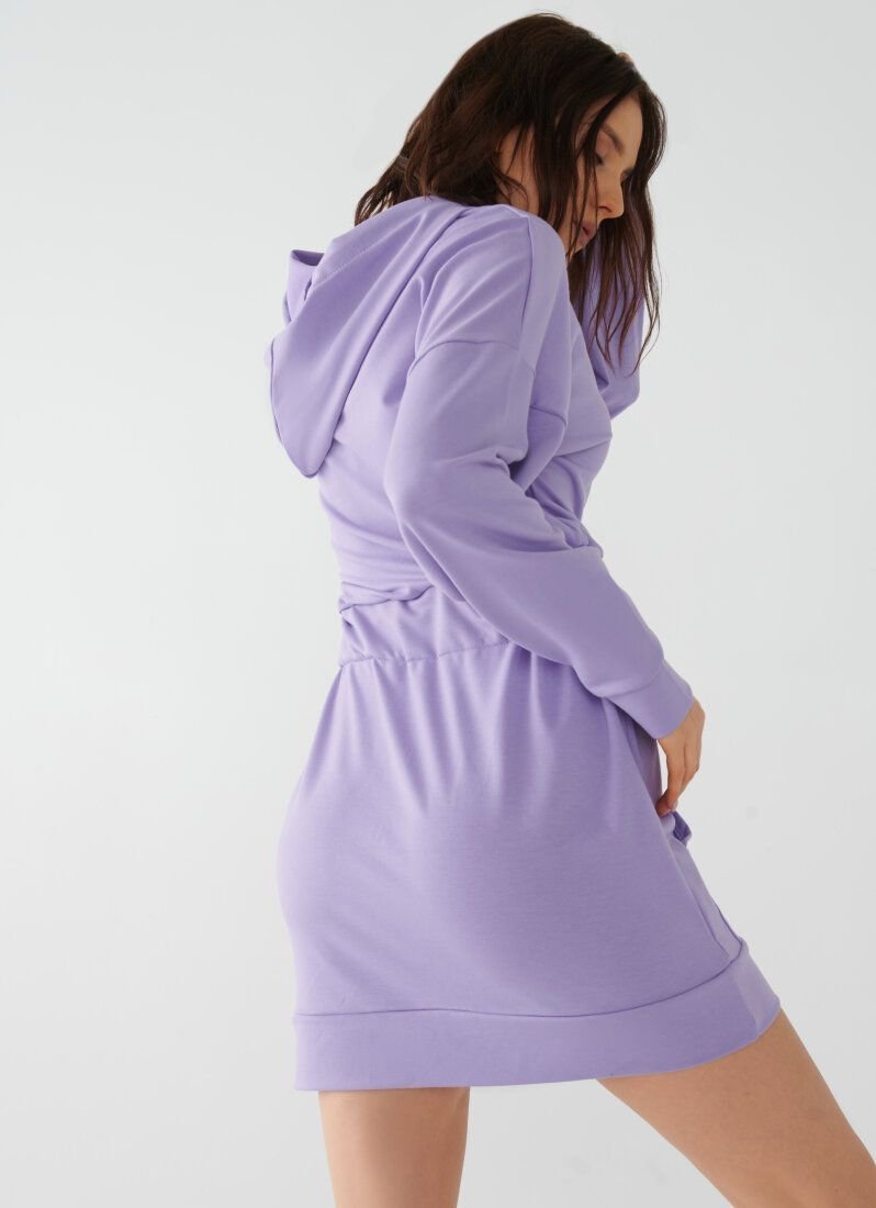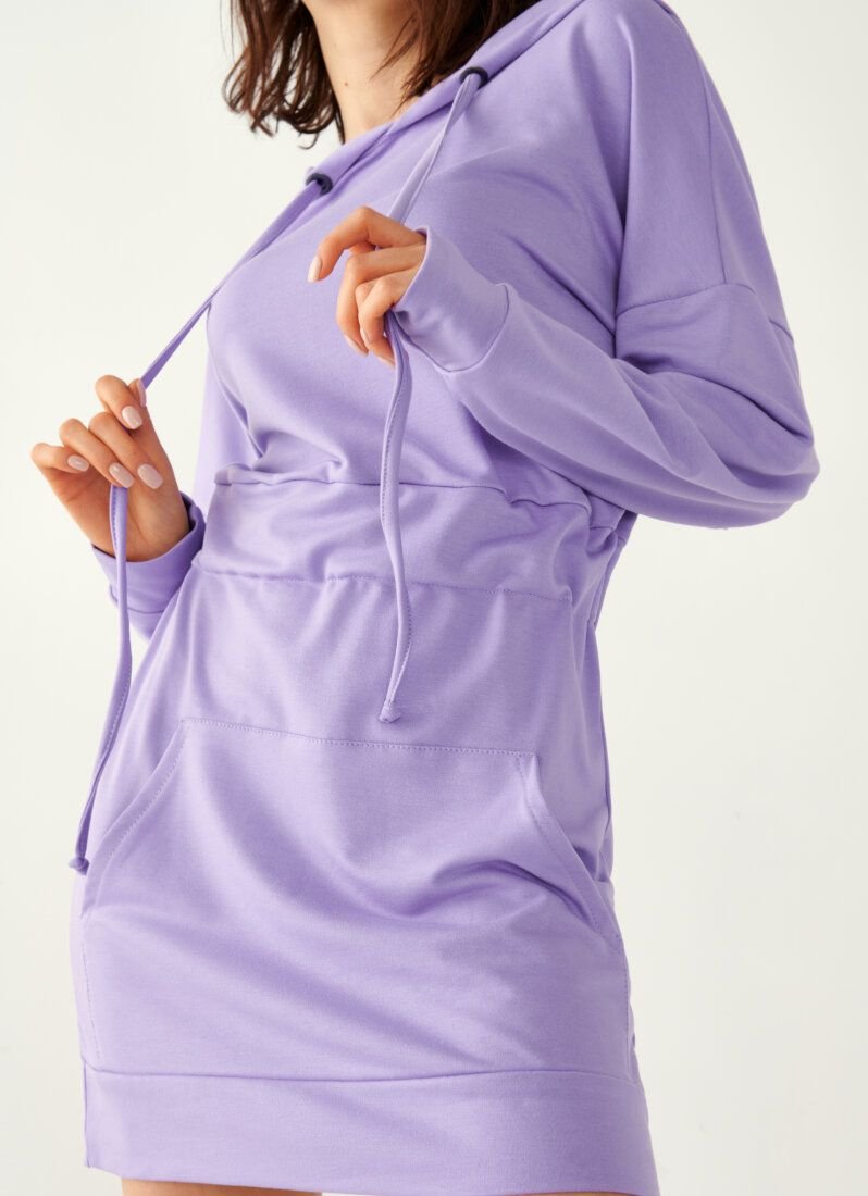 A sporty mini dress in a lilac shade relies on comfort. The model made of soft knitwear comfortably fits the body. The waist is emphasized by an elastic waistband. The front skirt is complemented by a kangaroo pocket.