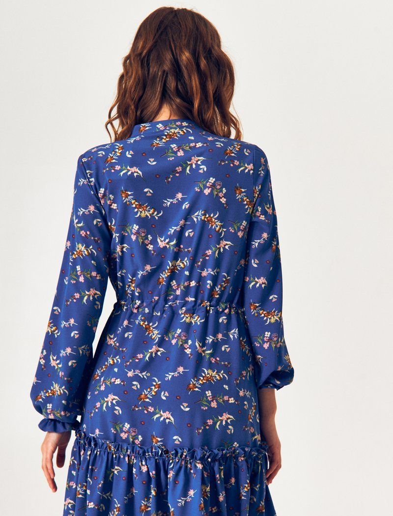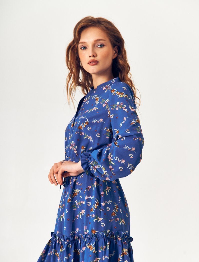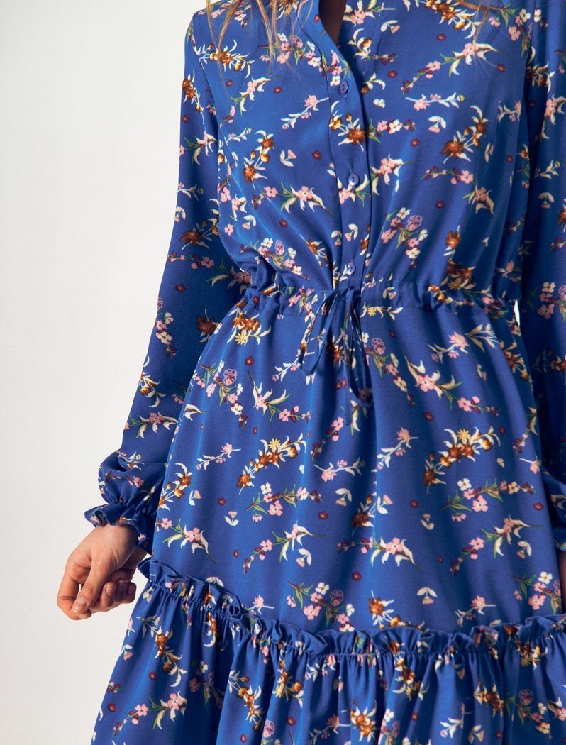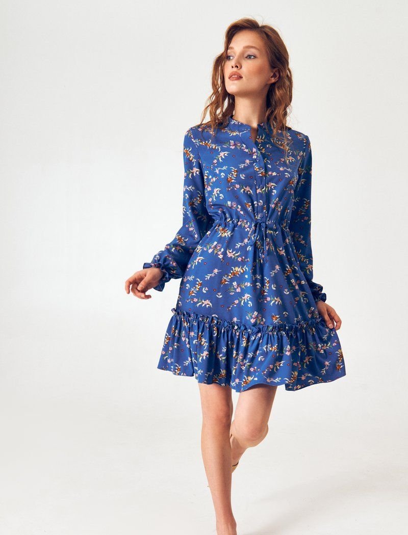 The blue mini dress is decorated with flowers, which have become an actual pattern of the SS'21 season. Models with this print could be found in the seasonal collections of Valentino and Balenciaga. The loose cut of the product was diversified with a drawstring at the waist and a flounce at the hem.