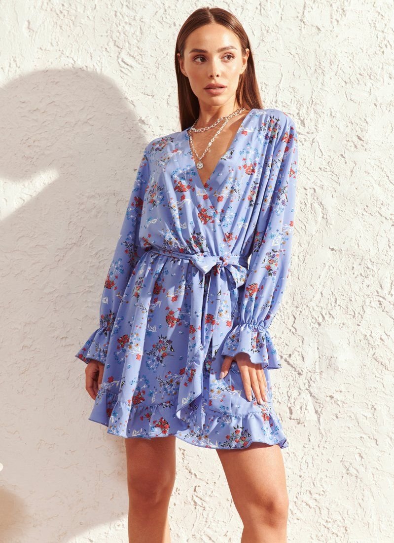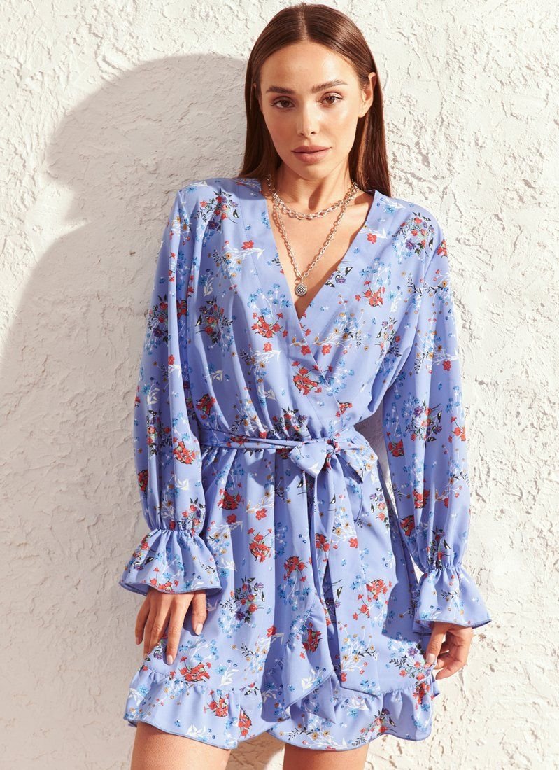 The mini dress for the smell is made of a light material that fits nicely to the body. The model is made in a blue shade, complemented by a belt, floral print and voluminous sleeves in the spirit of the SS’21 Bottega Veneta and Balenciaga shows.