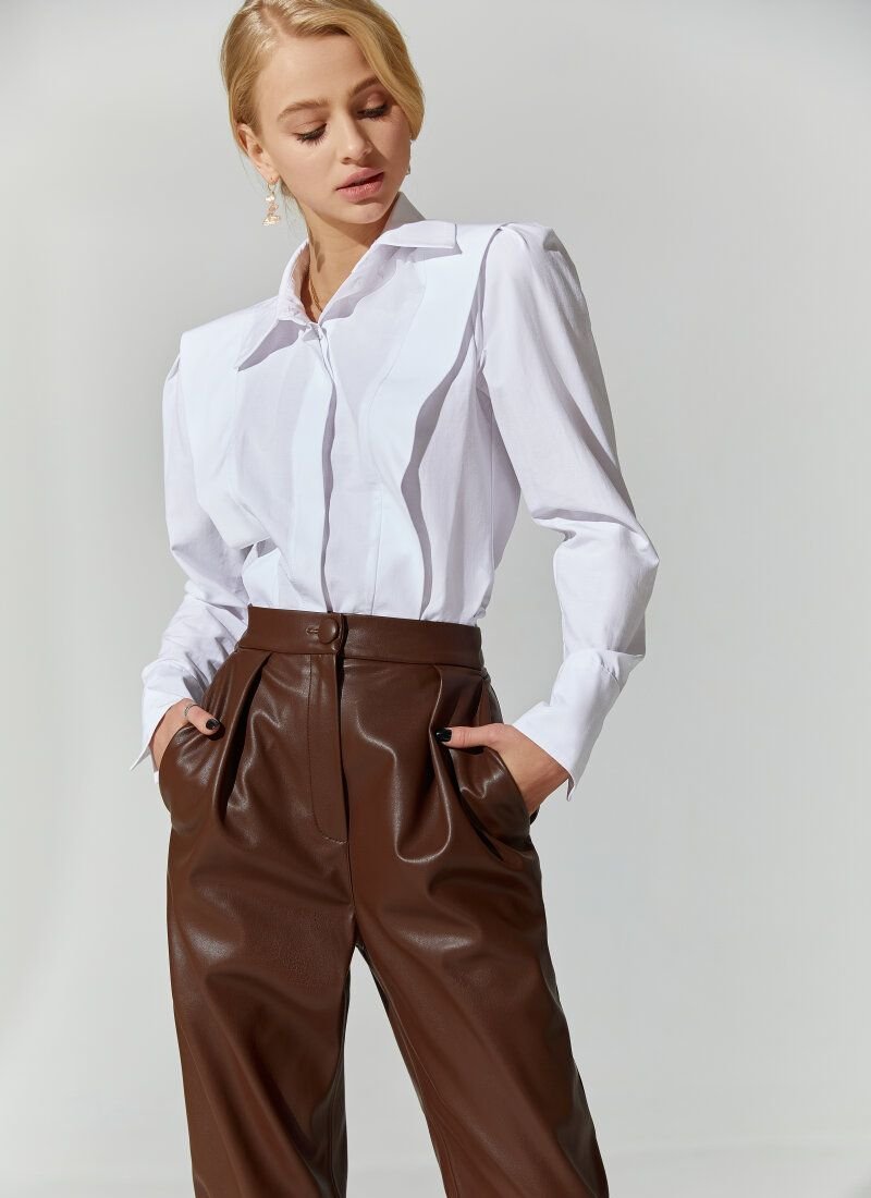Gepur designers have given the laconic cut of a classic white shirt expressiveness, emphasizing the shoulder line with clear wide ruffles. A blended cotton fabric was used for sewing a fitted product. This model will successfully fit into a non-strict office kit, and into a casual look with jeans.