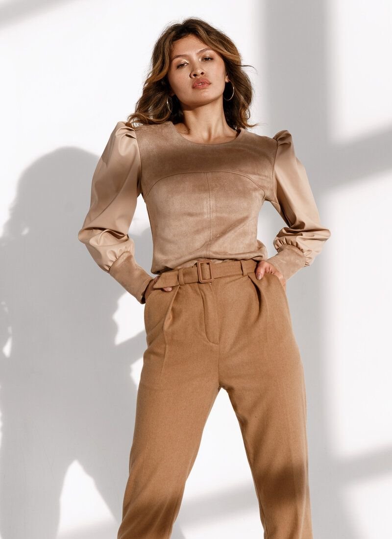 Beige jumper combines two trendy textures of materials at once: leather and suede. The model will be a successful addition to the casual image.