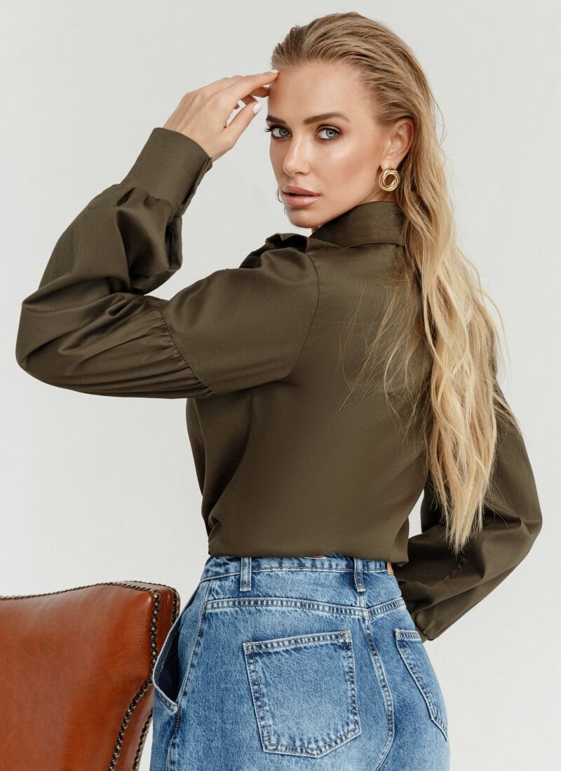 Stylish women's khaki shirt made of thick cotton fabric. A classic stand-up collar, a puffy sleeve with a button cuff and a yoke decorated with ruffles.