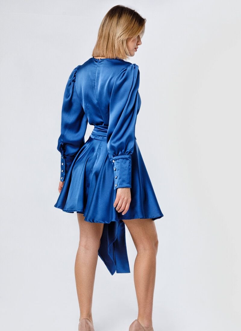 It's hard to go unnoticed in this blue dress. The silky material delicately shimmers in motion. The fabric is draped with soft folds in a flared asymmetrical skirt. Another special effect is a wide belt with a double buckle, which forms a beautiful waistline and falls down the front.