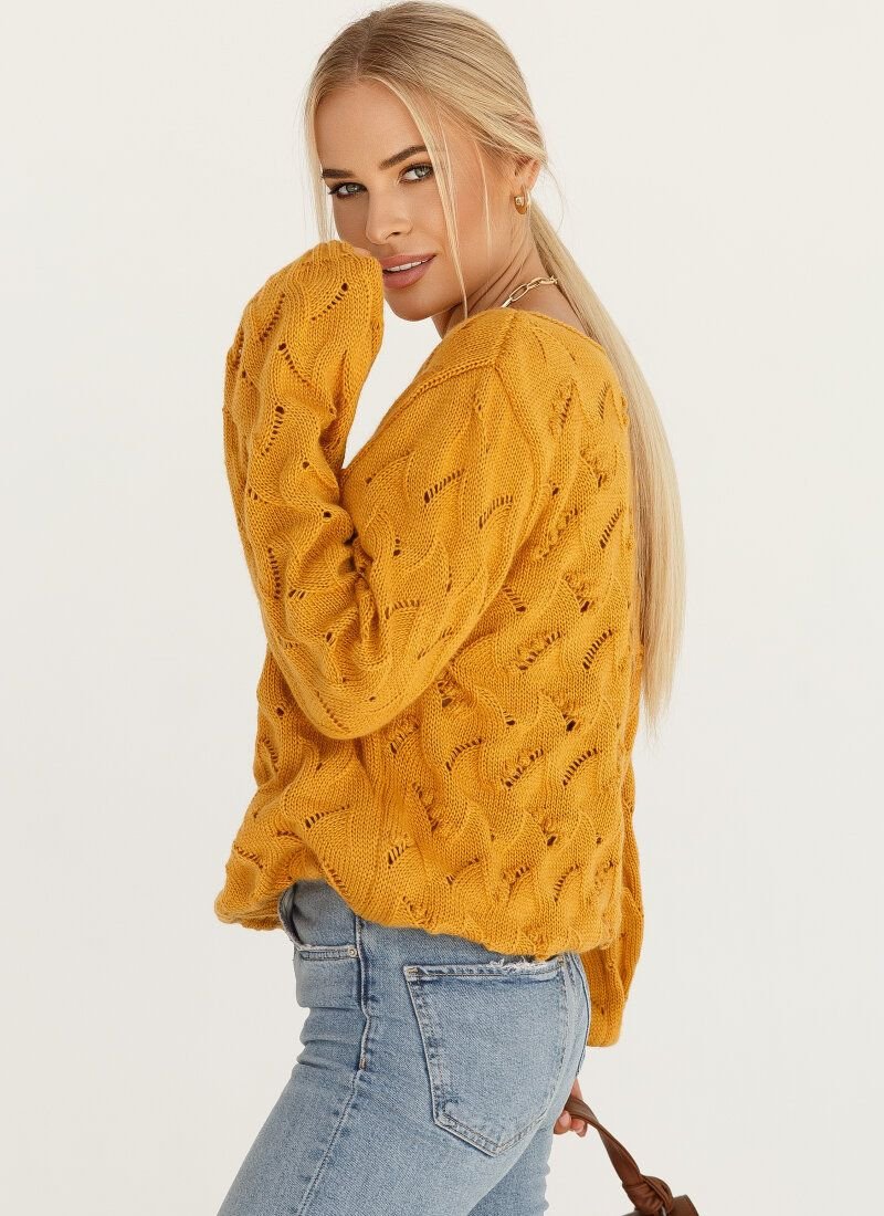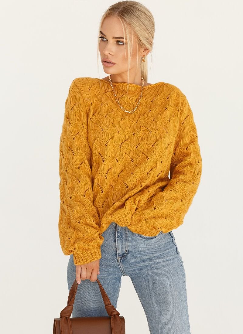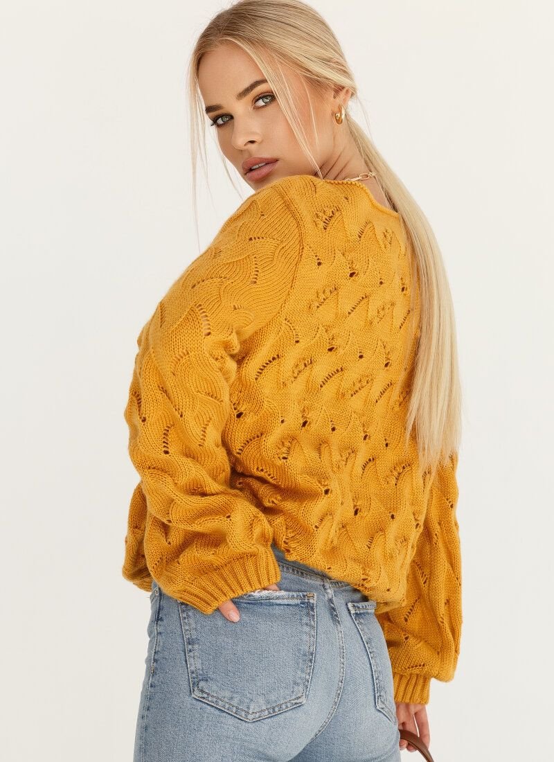Mustard jumper with a textured volumetric pattern resembling miniature berries. The product is made of soft yarn. Due to the material, the model is especially light, retains heat well and pleasantly wraps the body. The wide long sleeve is complemented by an elastic cuff.