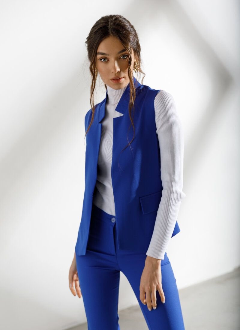 Trendy pantsuit: a vest without a clasp with a stand-up collar and two flap pockets, straight-cut trousers with a medium button fit.