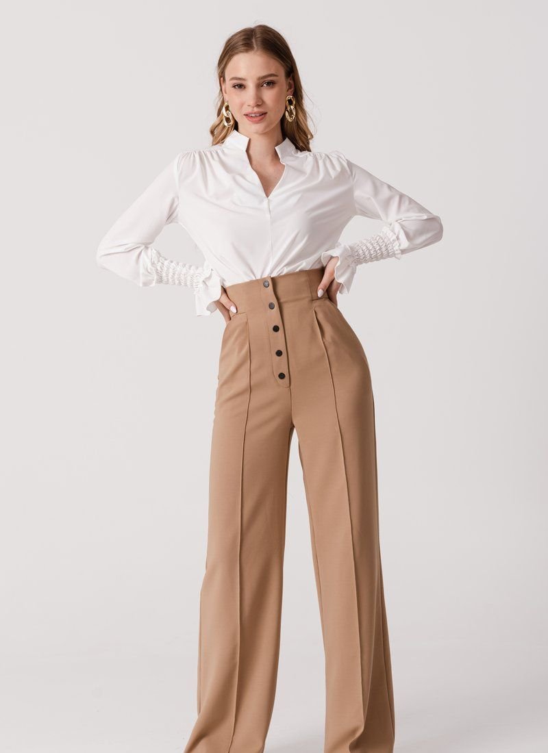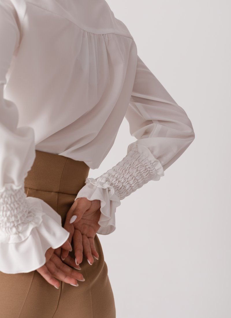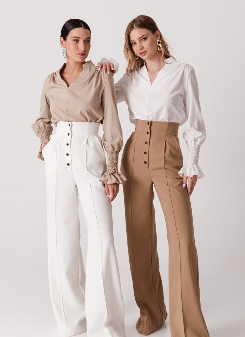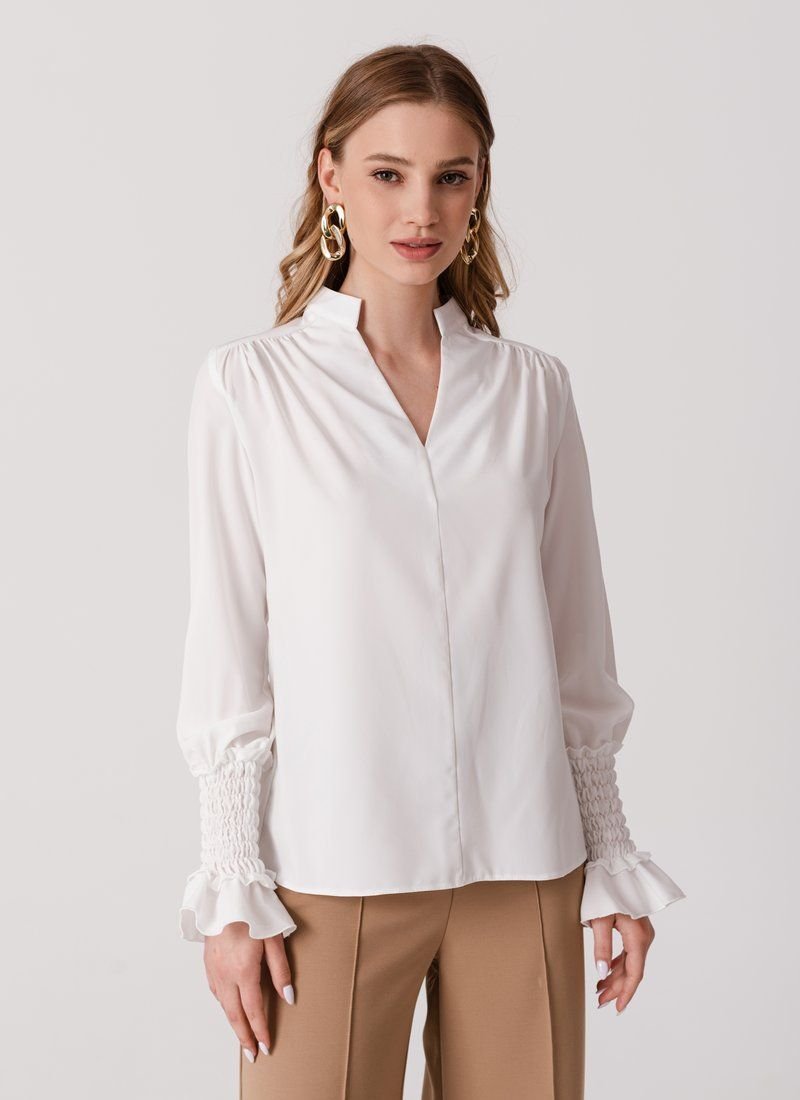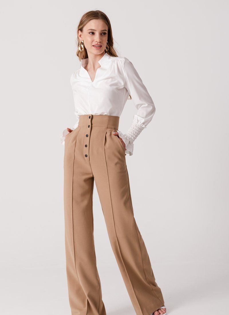 A loose white blouse with a stand-up collar refers to the Victorian style, which is included in the list of current trends of SS'21. For sewing a model with a V-neck, visually lengthening the neck, and draperies on the sleeves, a pleasant and light material was used.