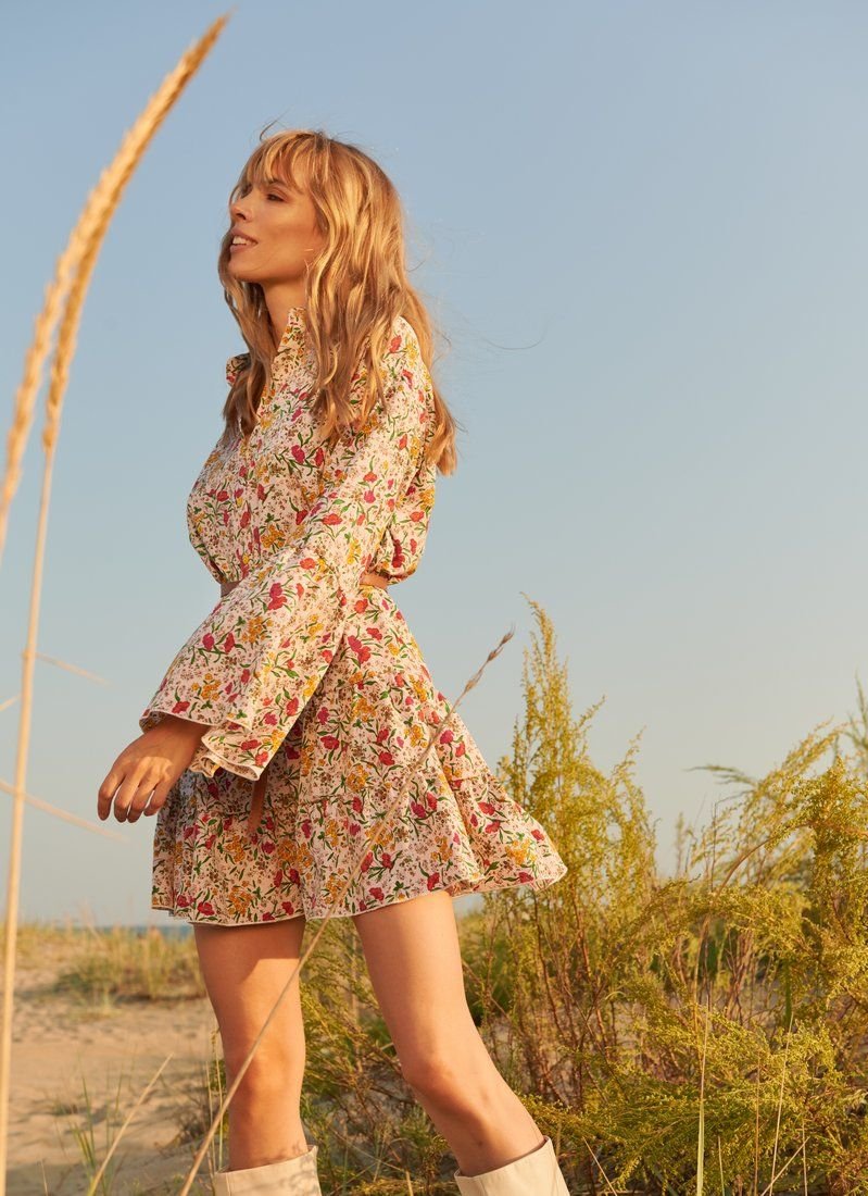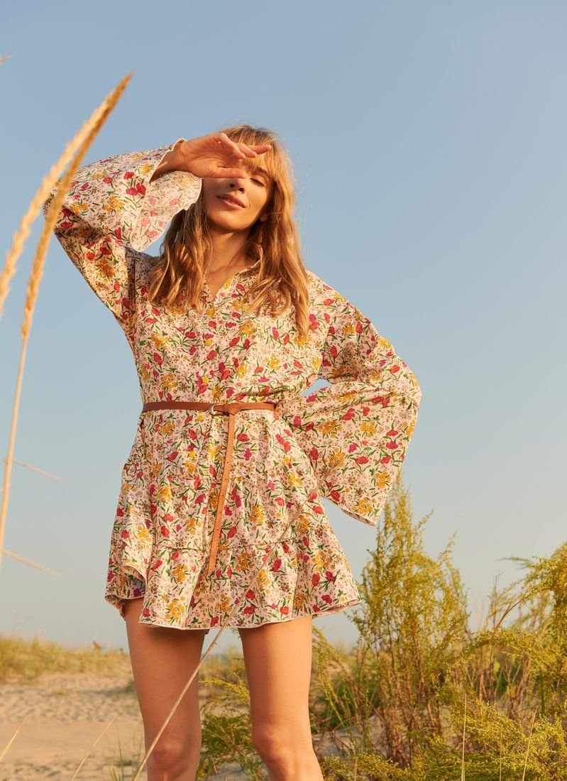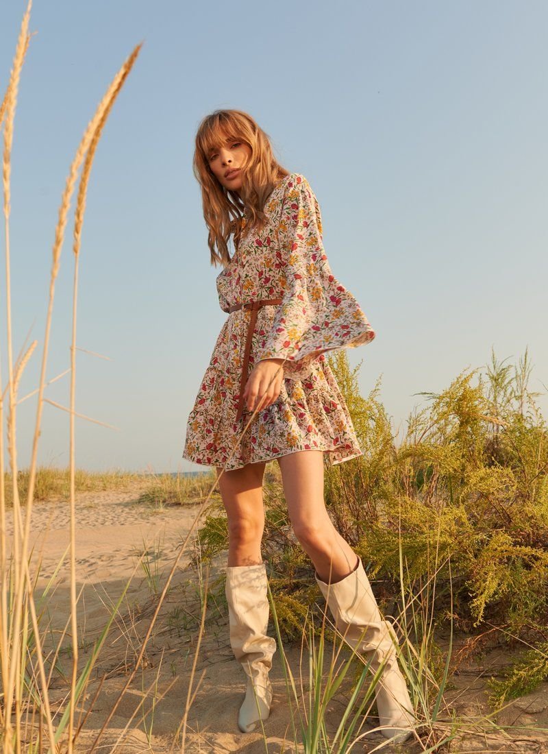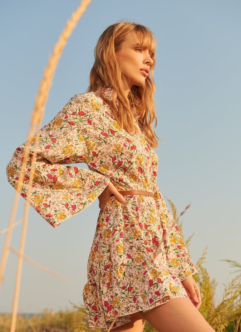 A romantic dress of a loose cut, made of light fabric in a floral print. A short stand-up collar, a spectacular flared sleeve with a flounce and a tiered skirt. The set includes a removable strap made of eco-leather.