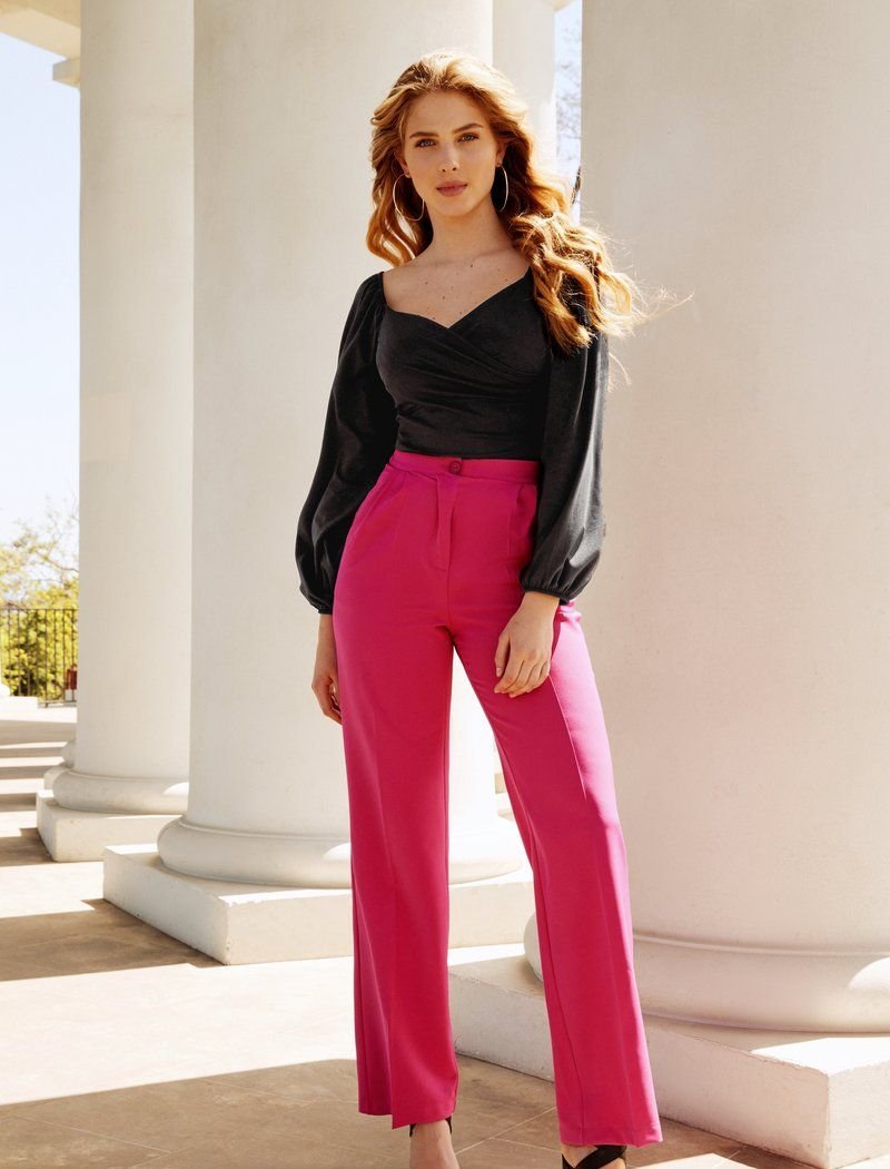 Designers this season recommend focusing on juicy and cheerful shades. Straight trousers in a crimson shade are perfect for this trend. The model was supplemented with an elastic insert at the waist and side pockets for convenience.