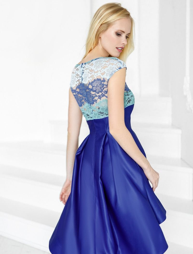 A cocktail dress from Gepur designers, with a colored guipure yoke, a neat short sleeve and an asymmetric skirt made of royal satin, forming a soft cascade. .