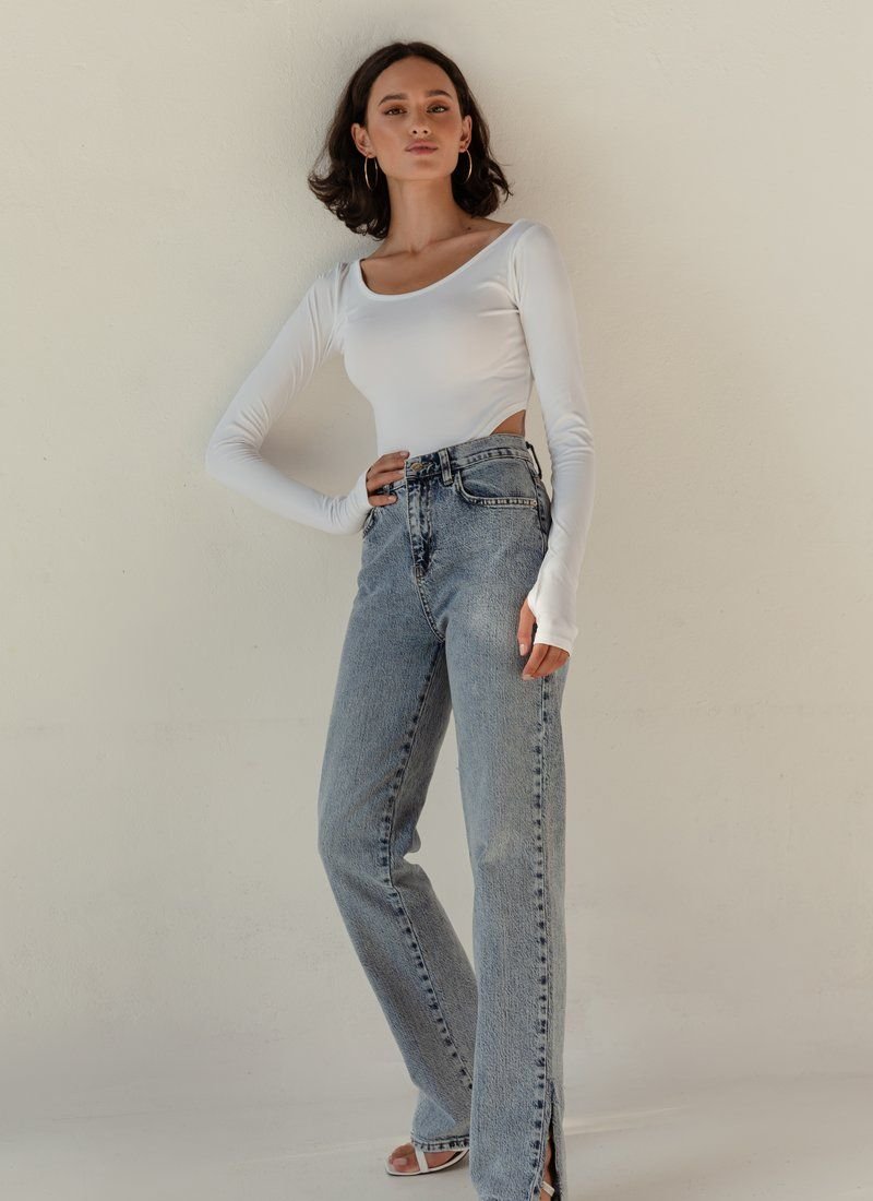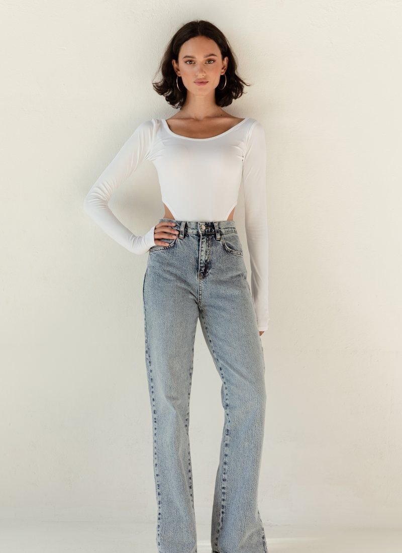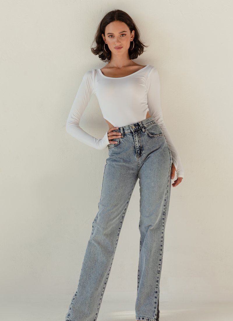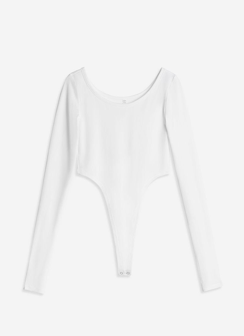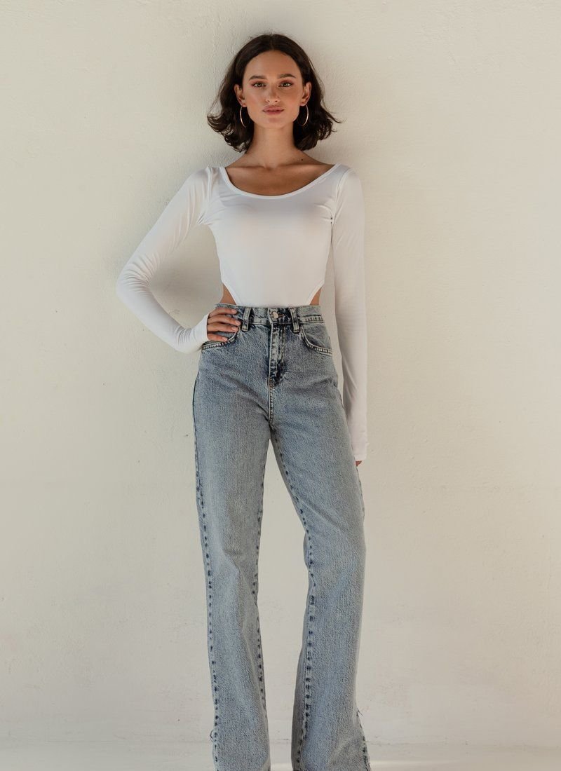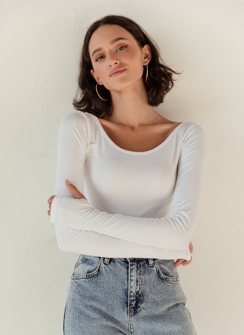 White cropped bodysuit with a round deep neckline, long sleeves with a thumb slot, with a button closure. It will be an excellent basic thing of your wardrobe, which can be combined in various images.