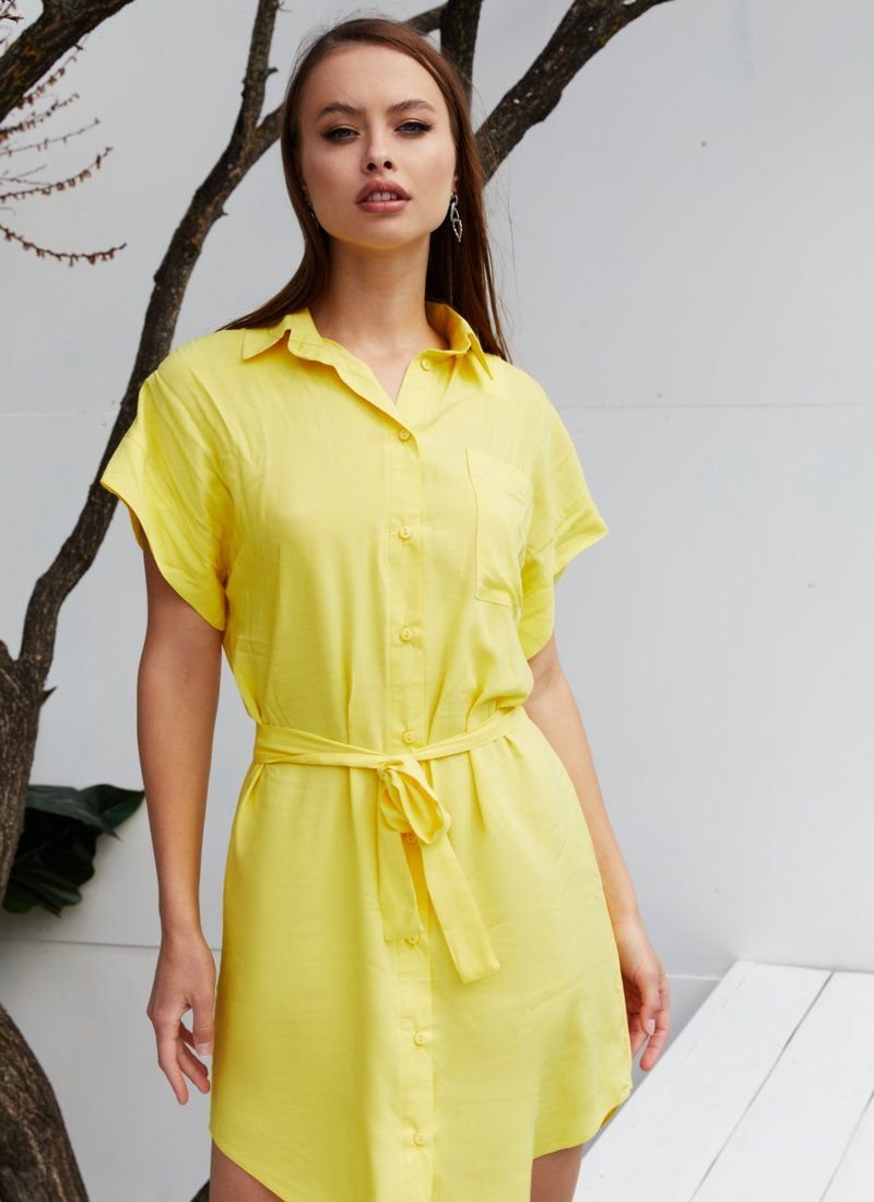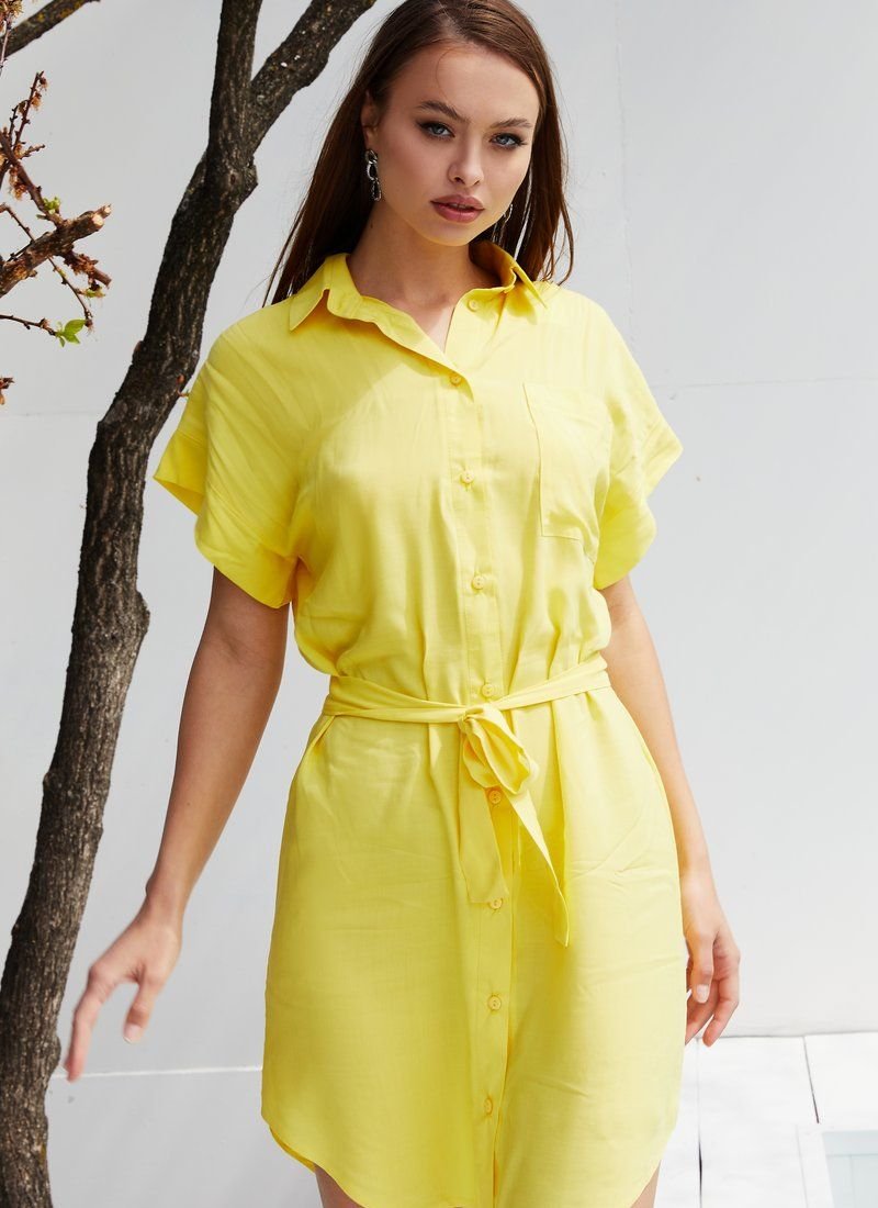 With all the minimalistic design, the shirt dress does not look simple. The mood was set using a rich yellow shade. Light cotton with the addition of synthetic threads was chosen for sewing the model. The waistline was accentuated with a belt-ribbon.