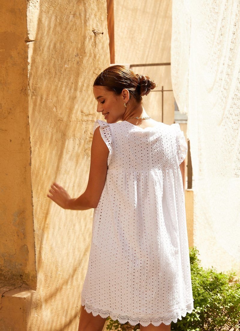 A light, loose-fitting dress made of cotton fabric with floral embroidery. The neat yoke of the dress is decorated with a v-neck and wing sleeves. The dress is complemented by two small pockets in the seams and lace trim at the hem.