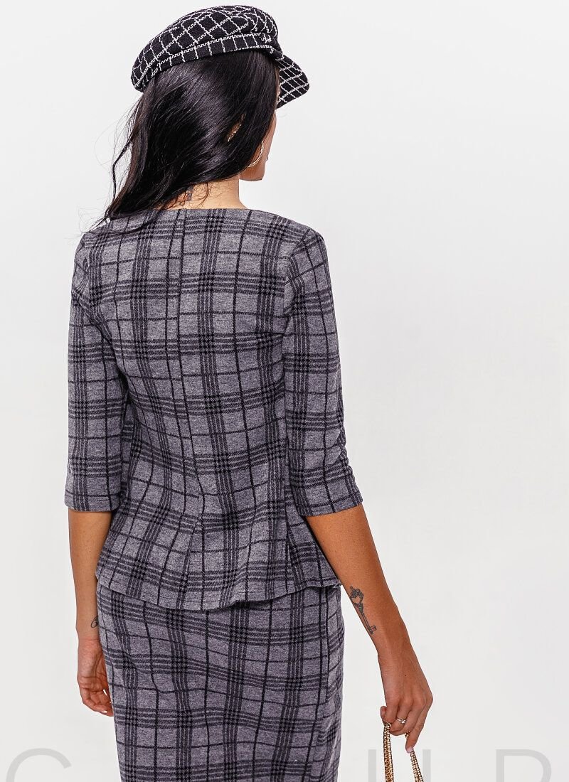 Knitted two-piece suit in gray: a classic fitted jacket without a collar and buttons with 3/4-length sleeves, an asymmetric midi skirt of medium fit for a fixed smell. ...