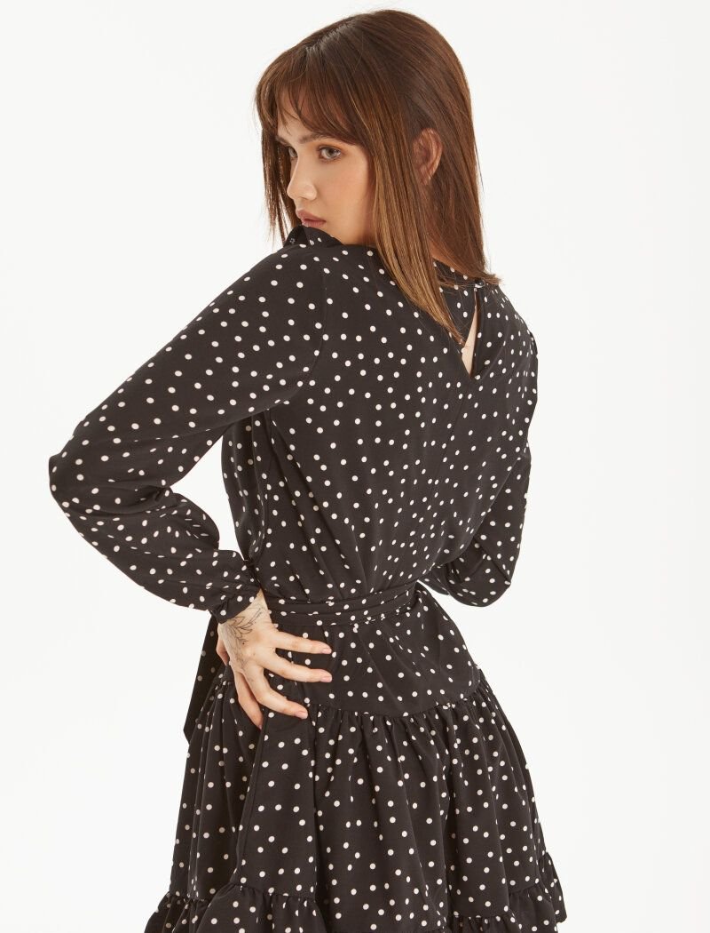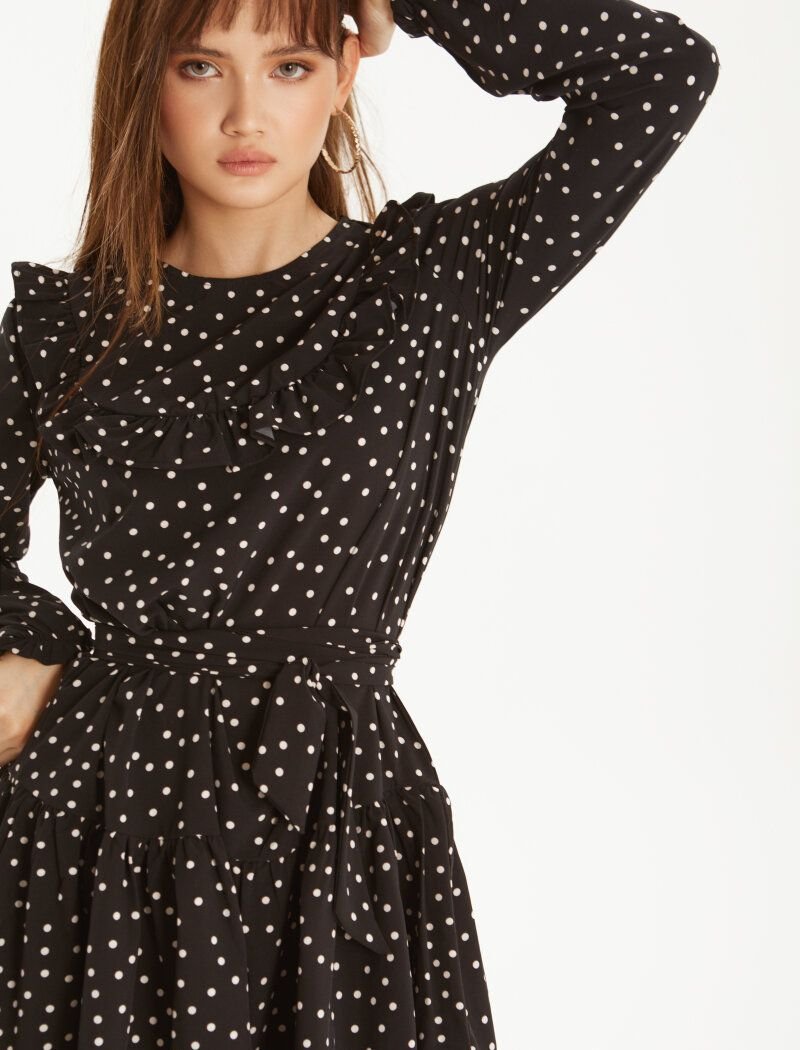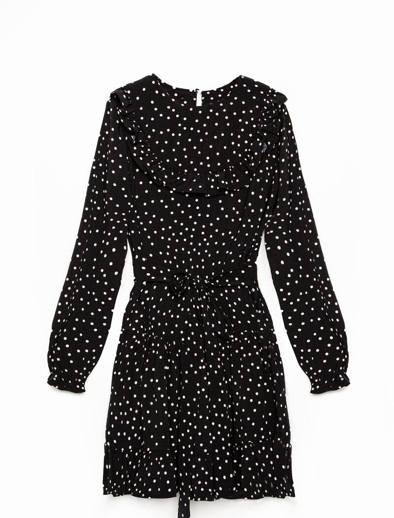 A short black dress in an elegant pea print. Loose fit. Round neck, long sleeve with elastic cuff. Ruffles on the chest, a removable belt to match and air flounces on the skirt.